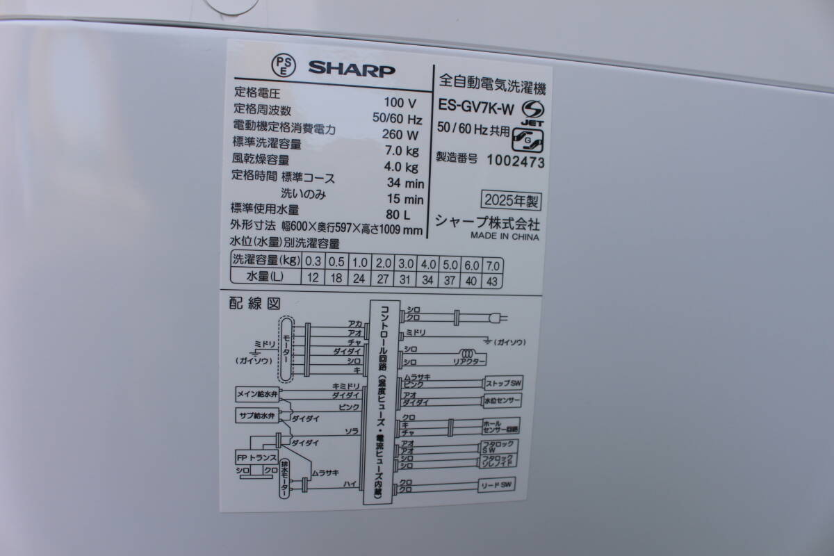 シャープ SHARP 全自動洗濯機 7kg ホワイト系 ES-GV7K-W 2025年製 デモ展示品