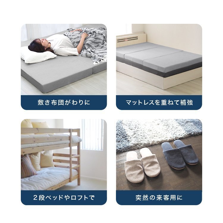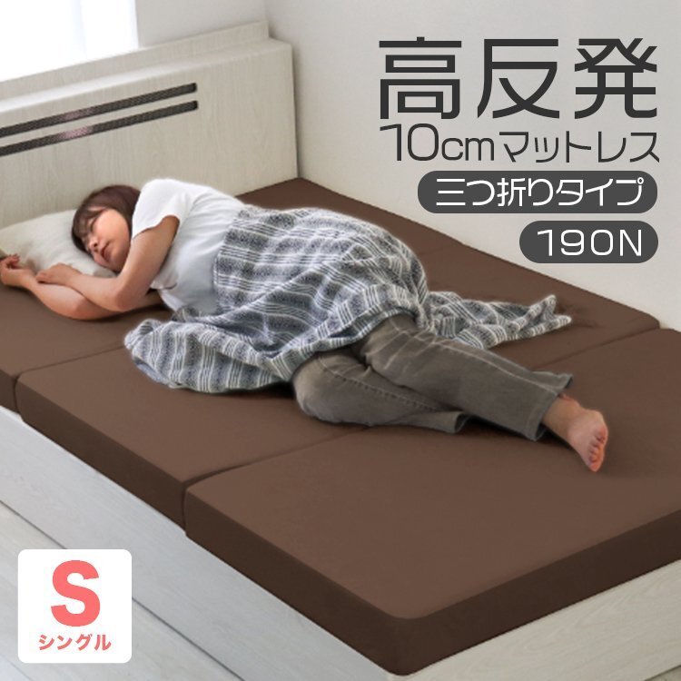 | 厚みたっぷり10cm! 適度な硬さで身体をしっかり支える、三つ折りタイプの高反発マットレスです。 柔らかいマットレスとは違い、身体の沈み込みを軽減した腰に優しい寝心地です。 高反発マットレスのウレタンフォームは弾性が高く、 適度な硬さで身体を支えるので、底つき感もなくへたりにくいマットレスです。 寝返りが多い方や仰向けに寝ることが多い方におススメです。 簡単にたためる三つ折りタイプなので、お部屋で立て置きして日当たりのいい場所で部屋干しが可能! 取り外しやすいL字ファスナー付き洗えるカバーが付属しています! ■商品コード:FEB002BR ■商品仕様 カラー:ブラウン サイズ(約)195cm×97cm×10cm(シングルサイズ) 折り畳み時(約):(約)65cm×97cm×30cm 重量(約):5.8kg 素材:高反発ウレタン 、パイル生地 他 硬さ:190ニュートン ■注意事項 ・圧縮梱包されたままの状態で長期間保管した場合、マットレスが復元できなくなってしまいます。 商品到着後、1週間以内に必ず圧縮から開放をして頂くようにお願いいたします。 ・マットレスは約1-2日で復元します。気温や温度により3-14日かかる場合もあります。 ・製品の臭いが気になりましたら、風通しの良いところで脱臭してください。 この臭いは素材のウレタンによるもので無害です。臭いに敏感な方は十分ご検討の上、ご購入をお願いいたします。 ・マットの硬さは温度によって変わってきます。また、硬さの感じ方には個人差があります。 ・カバーは取り外して洗濯ができますが、マットレス本体は洗濯しないでください。 ・生産ロットによって復元率・ニュートンに差異が生じる場合があります。 ・商品は、モニターによって色合いが異なって見える場合があります。 ・仕様・デザインは改良のため予告なく変更することがあります。 ■保障期間 7日間 ※商品到着後7日以内の初期不良・破損のみご対応させていただきます。 【新品未使用品です】 |