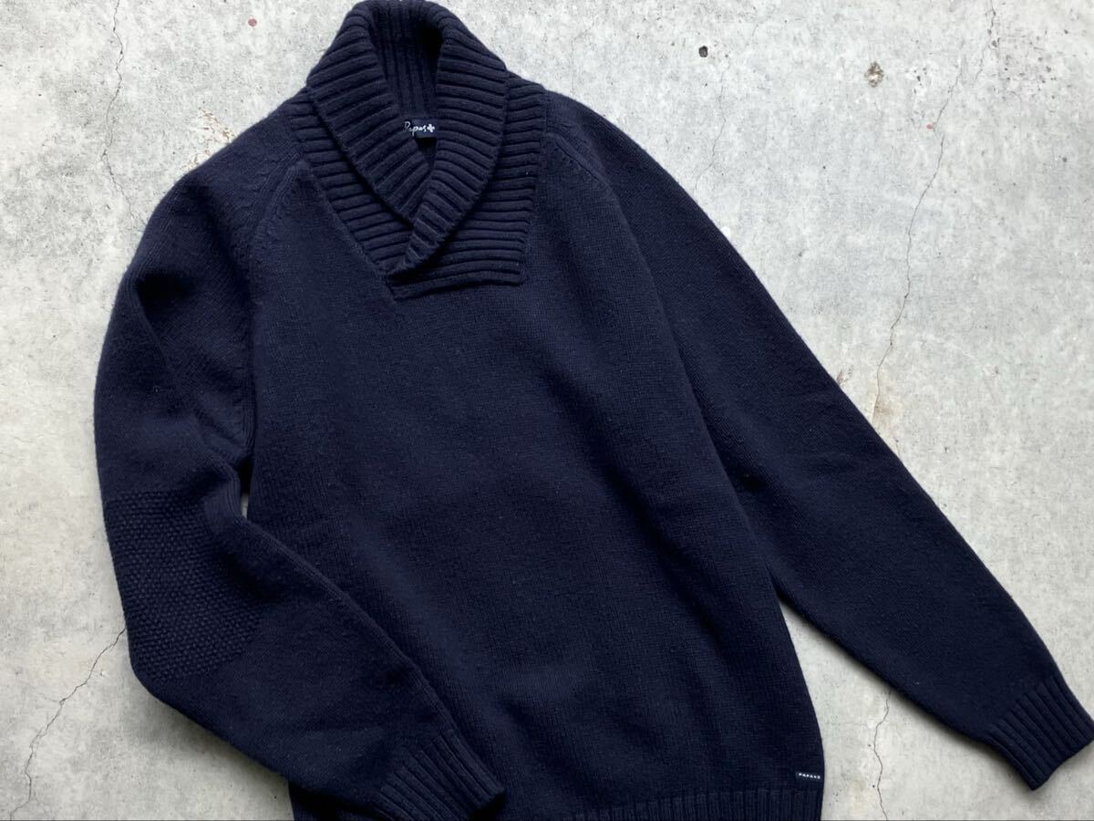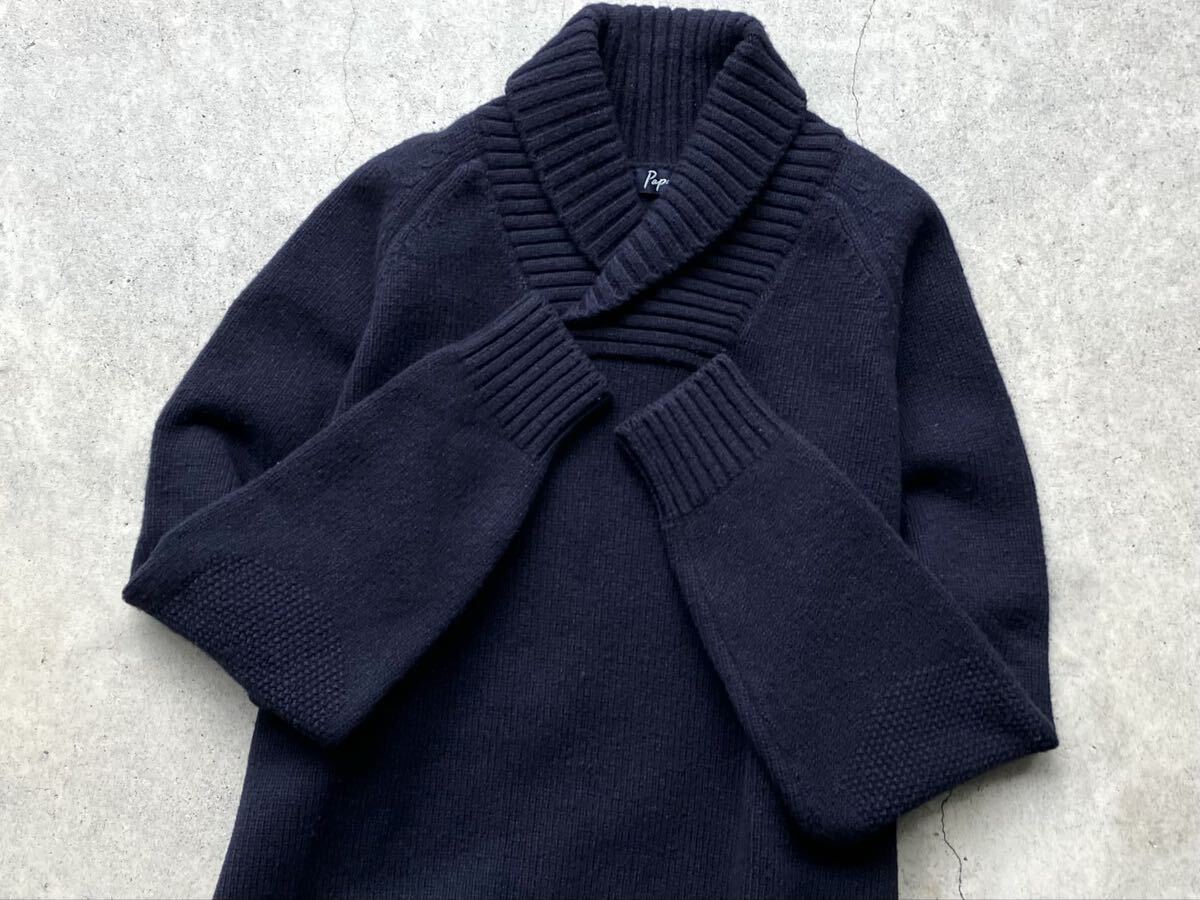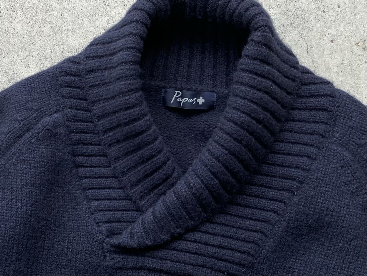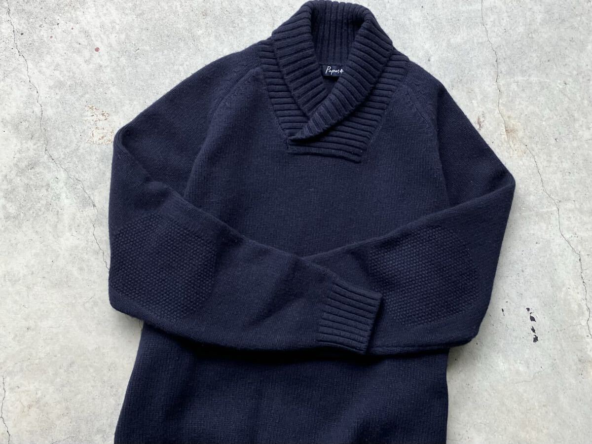 PAPAS PLUS ショールカラー仕様 カシミヤ混 ウールニットセーター M パパスプラス メンズ 紺 ネイビー