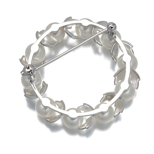 ホワイト系のお色味に仄かなピンクの干渉色を浮かべるテリ艶が神秘的な美しさを醸し出す ミキモト厳選アコヤ真珠のブローチ。細やかなミルグレイン細工で丁寧に描かれたリーフの煌めきも美しい一品ですよ。 |