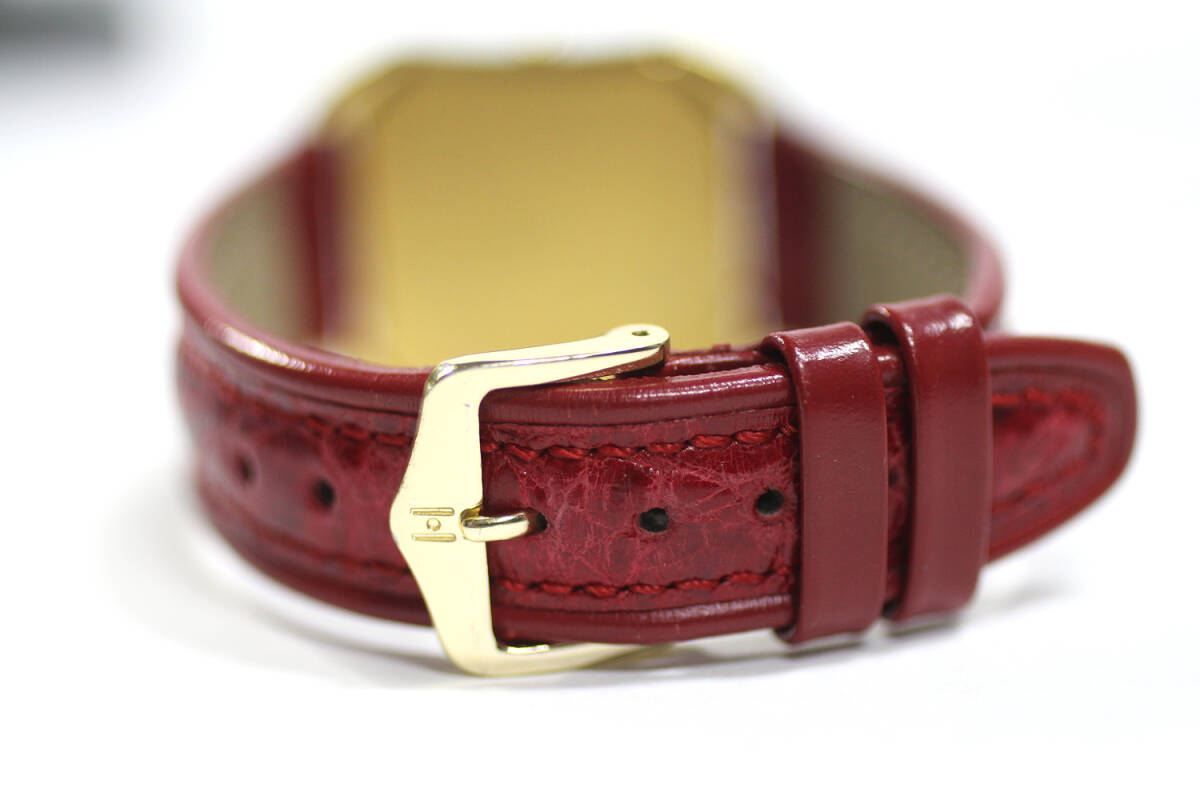 薄型のケースと赤系の社外レザーベルトが、クラシックで洗練された印象を与えます。