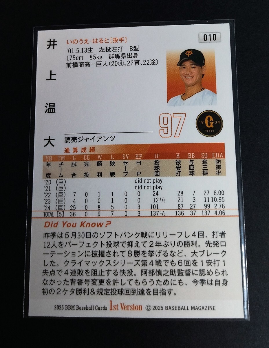 2025年BBM 1st 井上温大(巨人)銀箔サイン入り!No,010。
