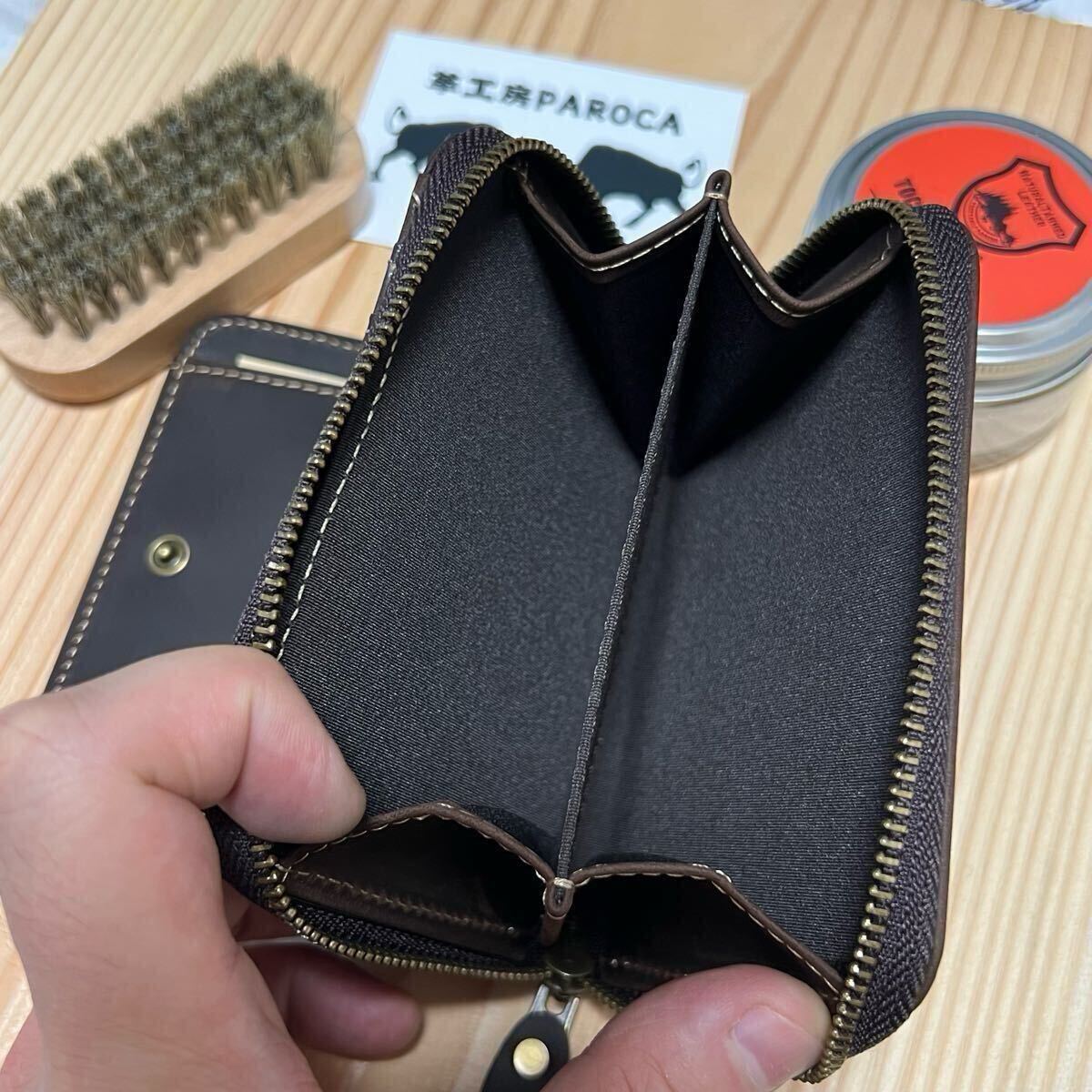 イタリアンレザーの中でも個性的な「オイルドヌバック」です。起毛した表面にオイルが染み込んでいます。手に持つと潤っている様子がよくわかります。