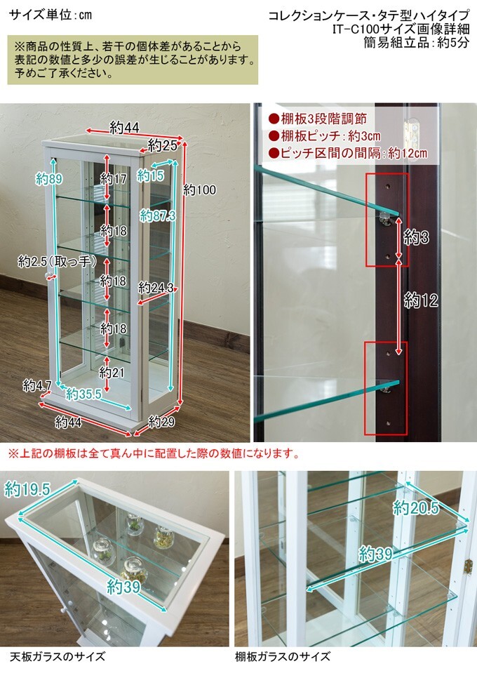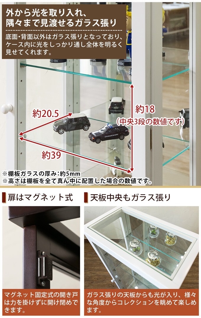 | 商品説明 | 簡易組立品(約5分) 背面ミラーでコレクションを綺麗に見せます! 棚板可動だから高さのあるものも入れられますね♪ 背面ミラーでどの角度からも楽しめるコレクションケースです。 ガラス棚板は4cmピッチで設置可能なので高さのあるものも入れられますね。 側面や上側もガラスなので、光をたくさん取り入れコレクションを明るく見せてくれます。 |