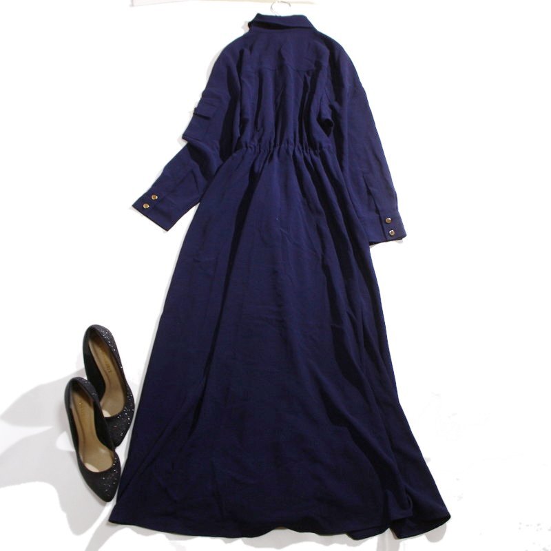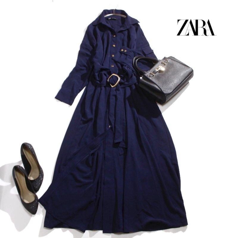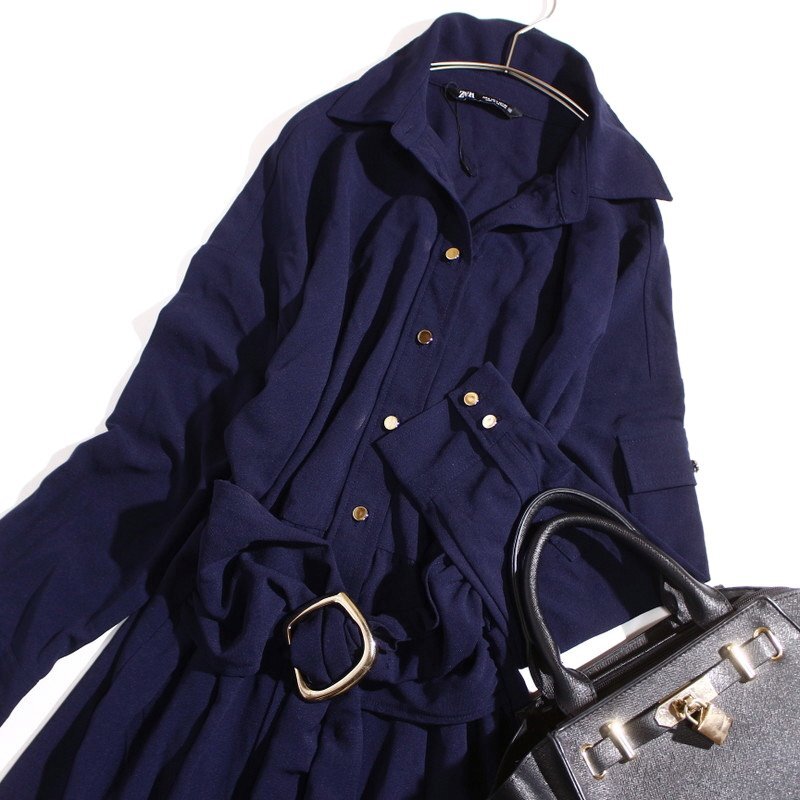 ZARAのロングシャツワンピースです。 深みのあるネイビーカラーが上品な印象を与え、幅広いシーンで活躍します。 ゴールドのボタンと、デザイン性の高いベルトがアクセントになっており、一枚でコーディネートが完成します。 美しいシルエットが特徴で、女性らしさを引き立てます。長袖なので、季節の変わり目から真冬まで長く着用いただけます。 ビジネスシーンはもちろん、カジュアルなお出かけにもぴったりな一着です。