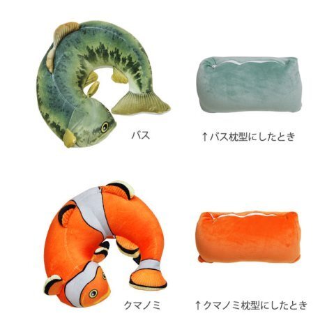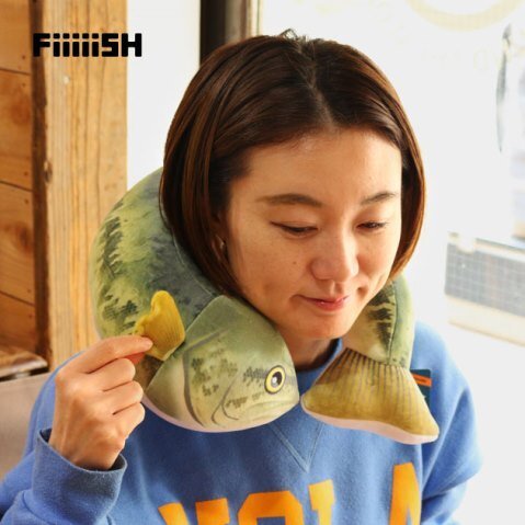 【商品概要】魚の形をした可愛らしいネックピロー。ヒレや色合いをリアルに再現しています。魚のお腹部分にファスナーが付いており、中身のビーズを移動させると長方形の枕に早変わり。長方形にするとスッキリするので持ち運びもかさばりません。飛行機や夜行バスなどでの移動に便利です。サイズ:幅30×高さ11×奥行30cm。TYPE:ブラックバス