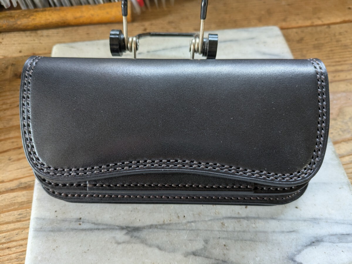 表面には約3.6mm、その他には約3.6mm、1..6mm、1.5mmの革を部位により漉きながら麻糸より強い蝋引きポリエステルの平糸で手縫いで製作しております。
