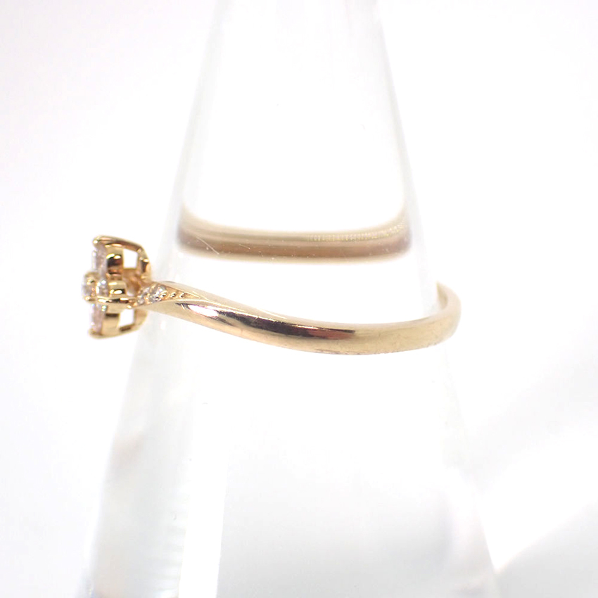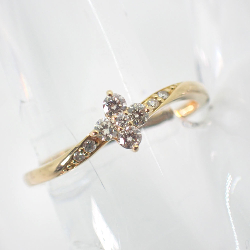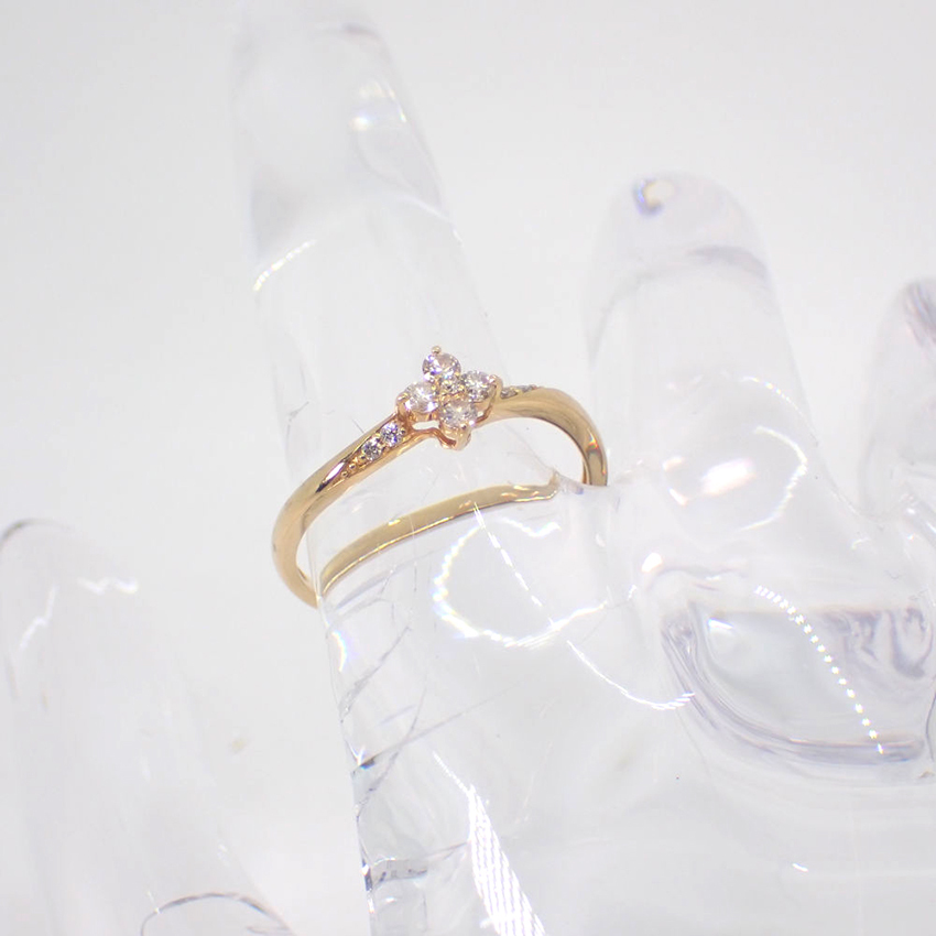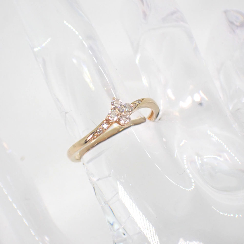 無色透明で輝きの強いダイヤモンドがあしらわれた美しいリングです。比較的小さい爪で留めた輝くダイヤモンドが、上品でフェミニンな印象の小花のモチーフが素敵です。