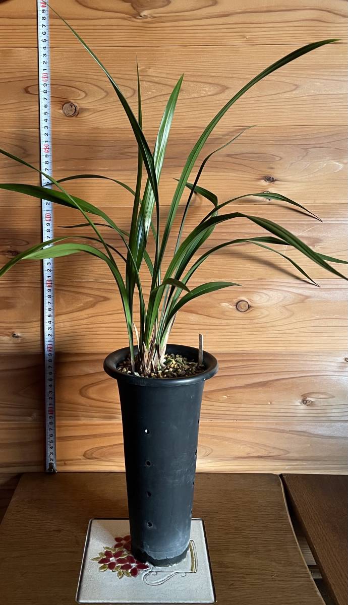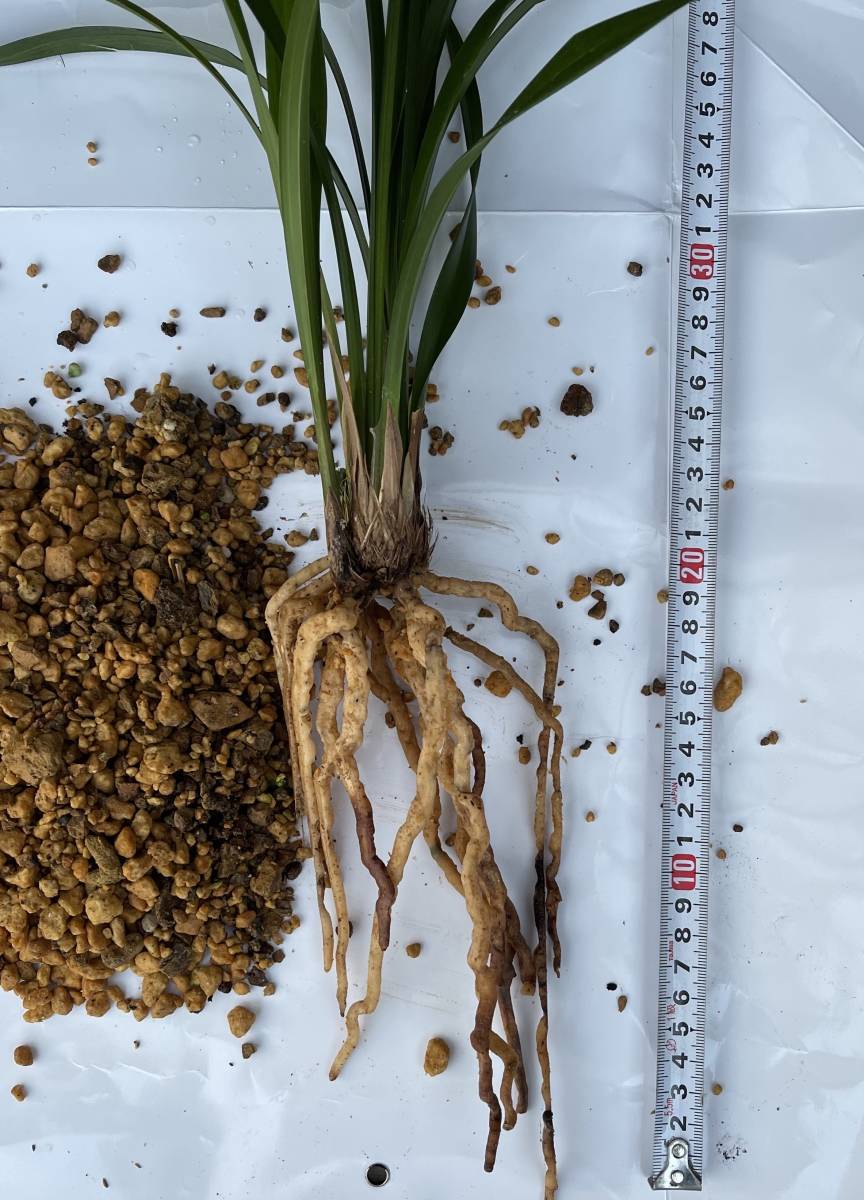 写真をご覧ください。葉は20~30cm、根は約20cm 白根土で育成しています。