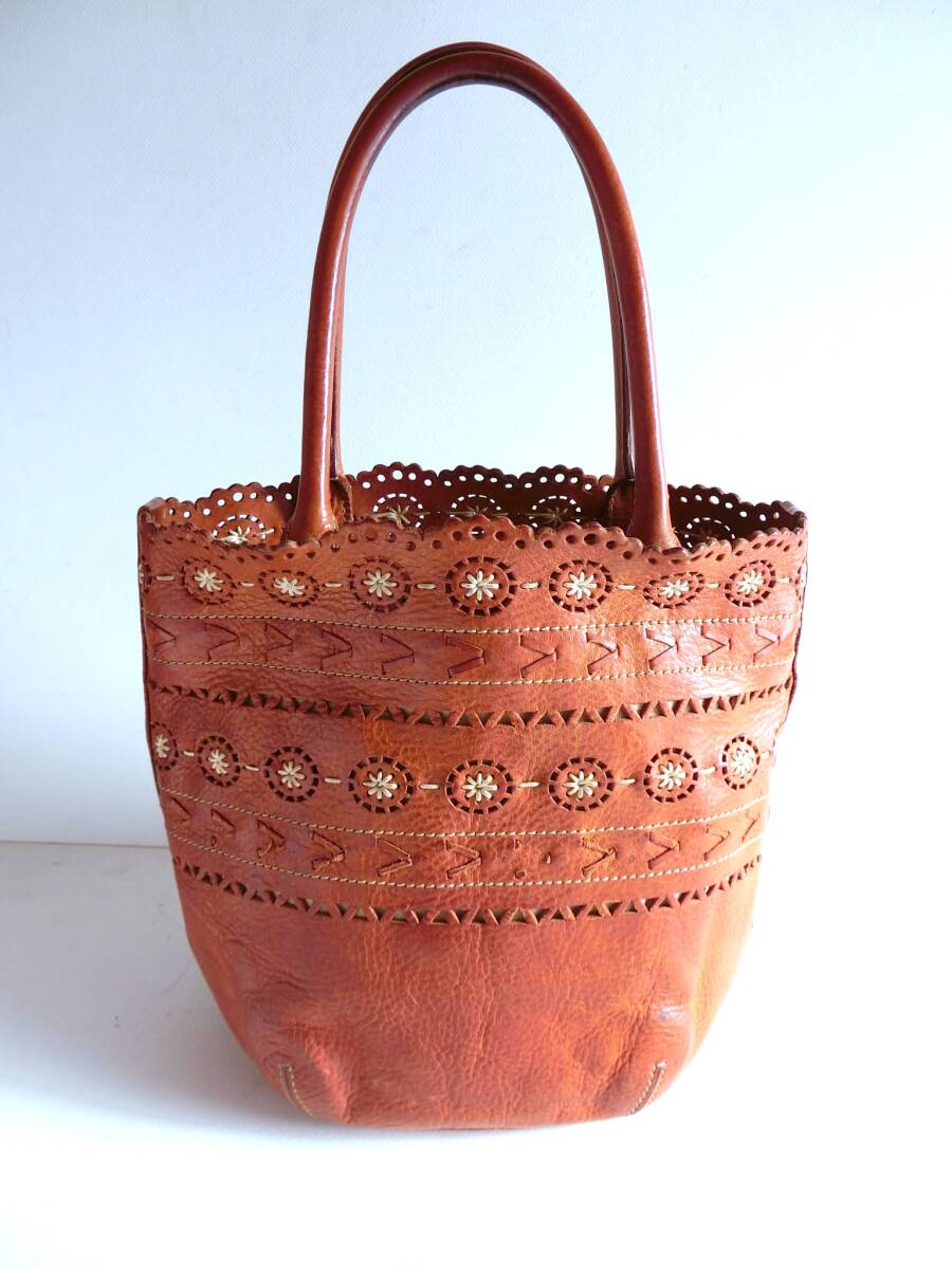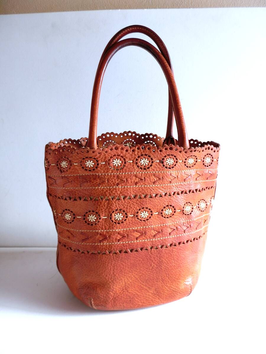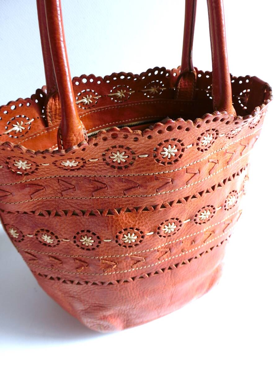 genten ゲンテン ヌメ革レザー カットワーク トートバッグ 透かし模様 花柄刺繍 バケツ型 ハンドバッグ 飴色 手提げ鞄 希少