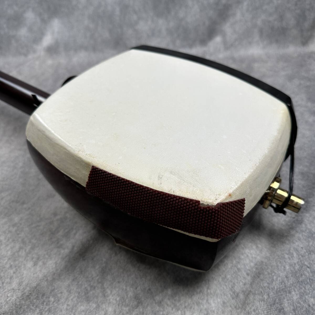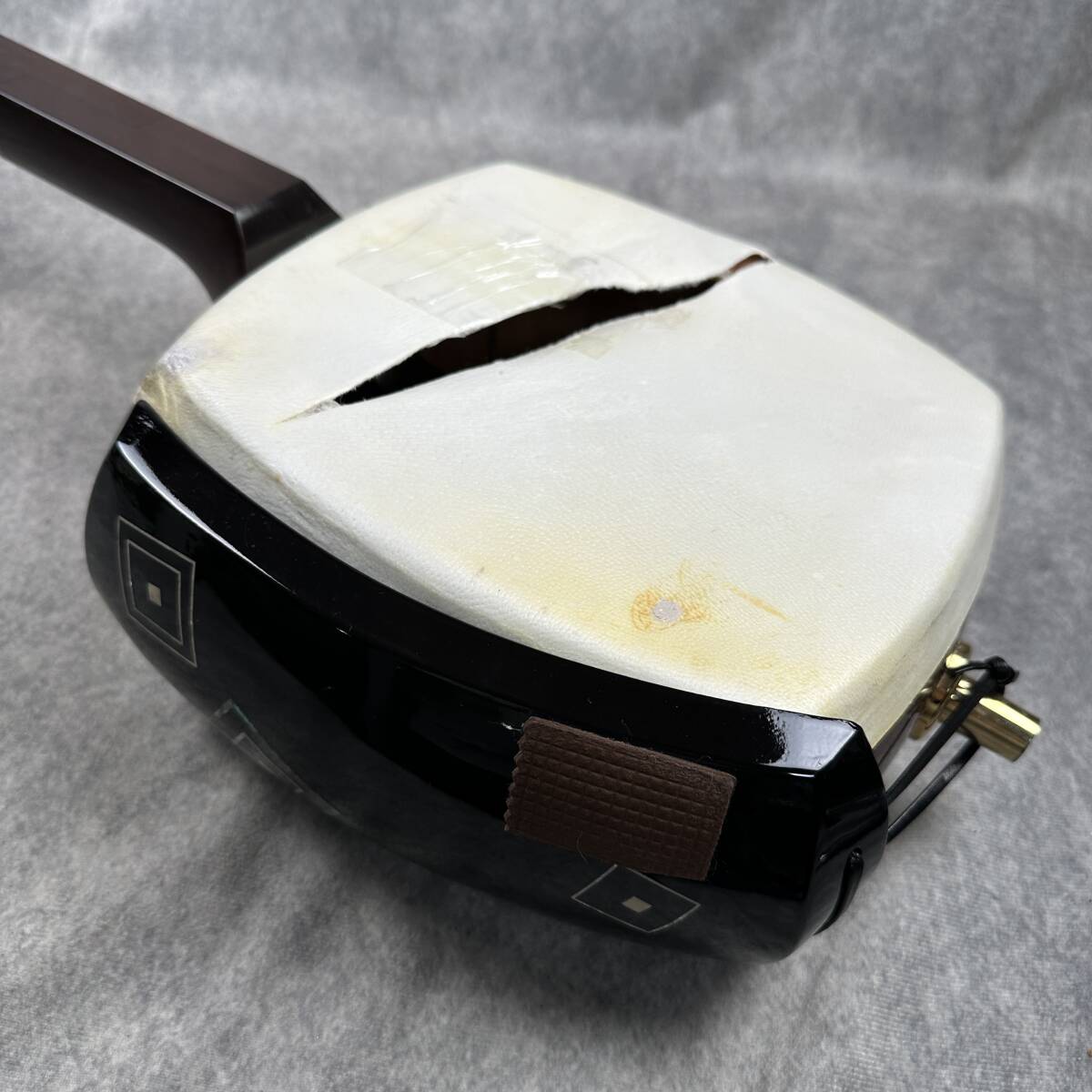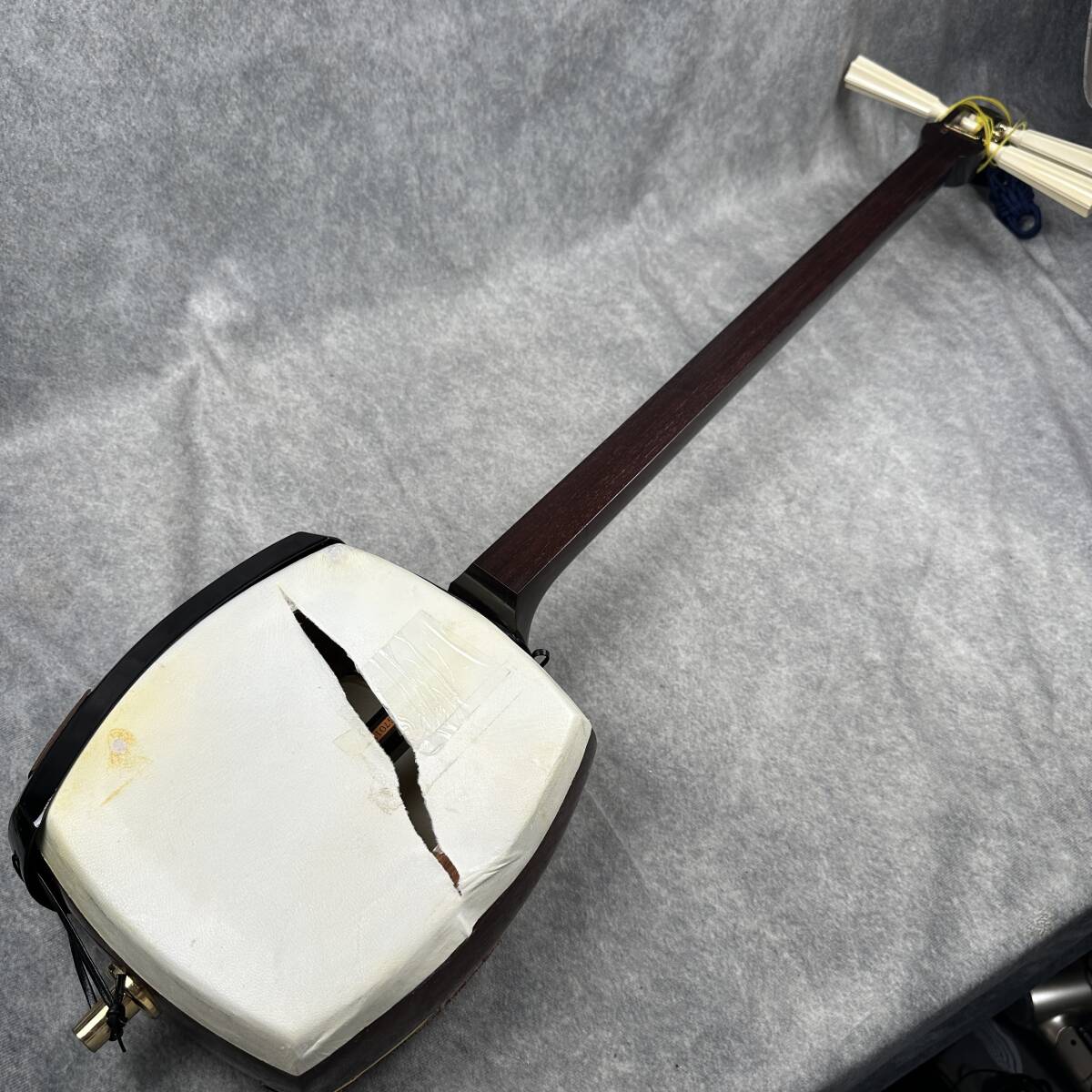 商品名:【現状品】津軽三味線 太棹 紅木 トチ入り 子持ち綾杉胴 二段溝 高級糸巻 ケース付き 皮破れあり