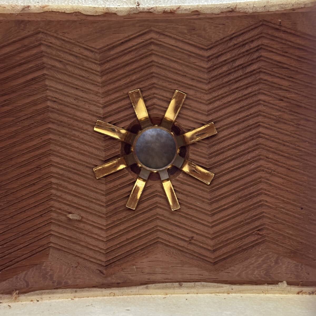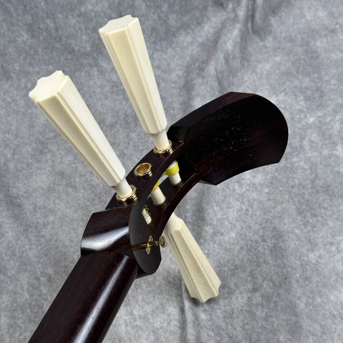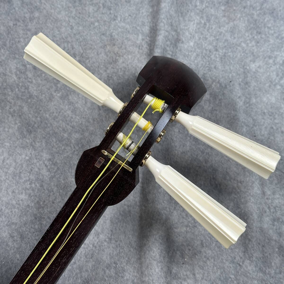 商品名:【現状品】津軽三味線 太棹 紅木 トチ入り 子持ち綾杉胴 二段溝 高級糸巻 ケース付き 皮破れあり