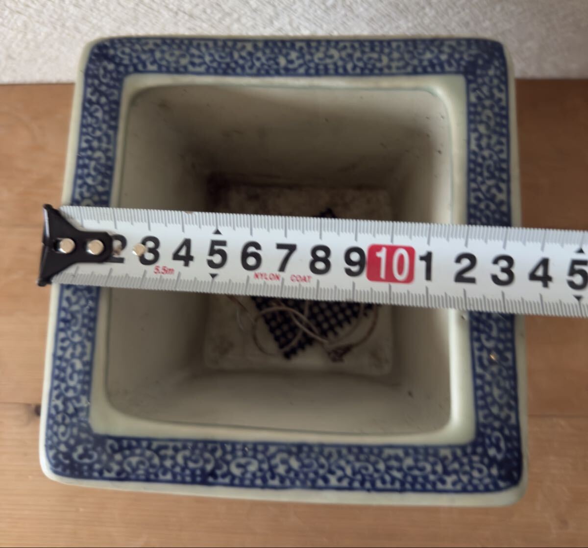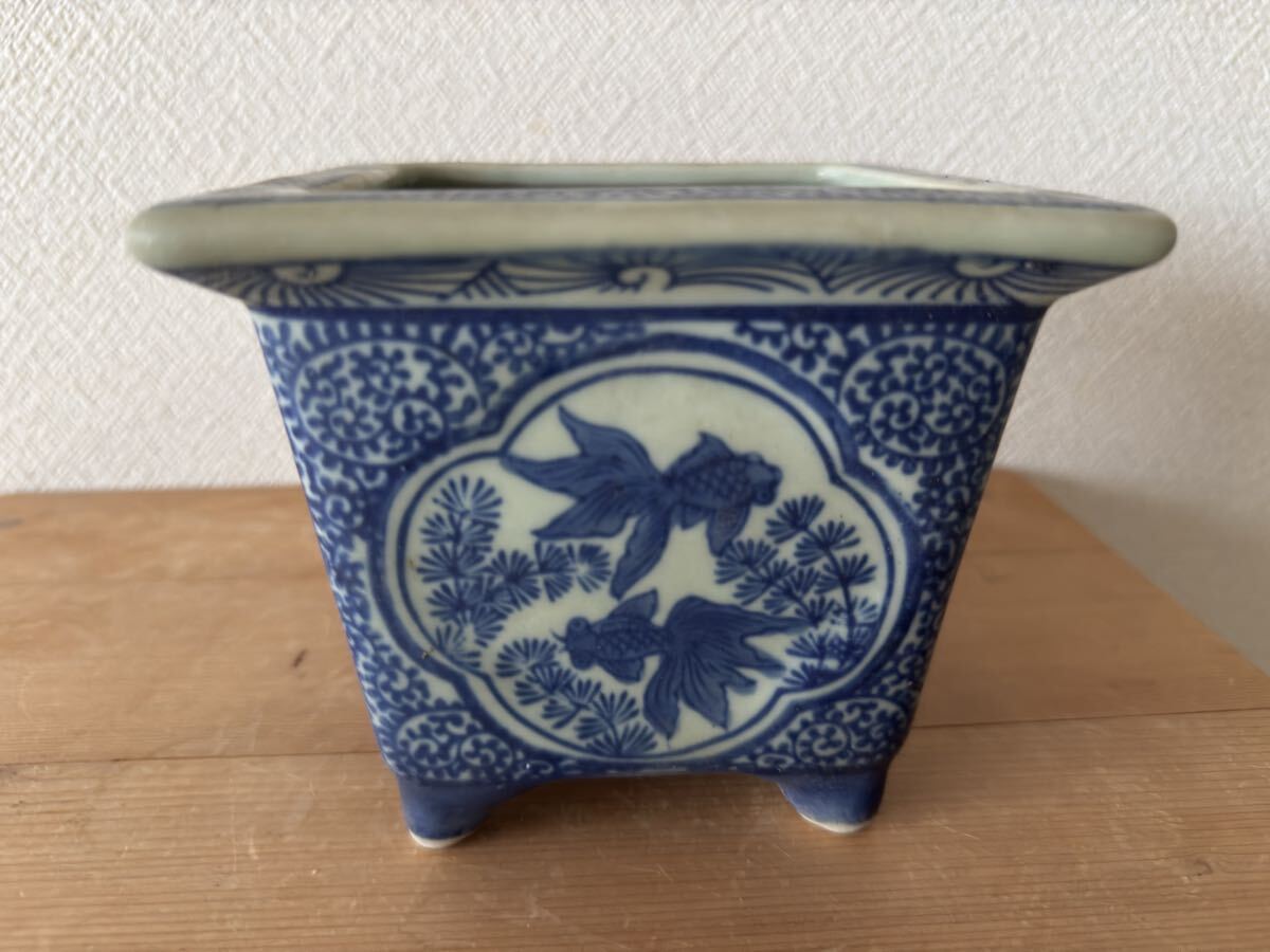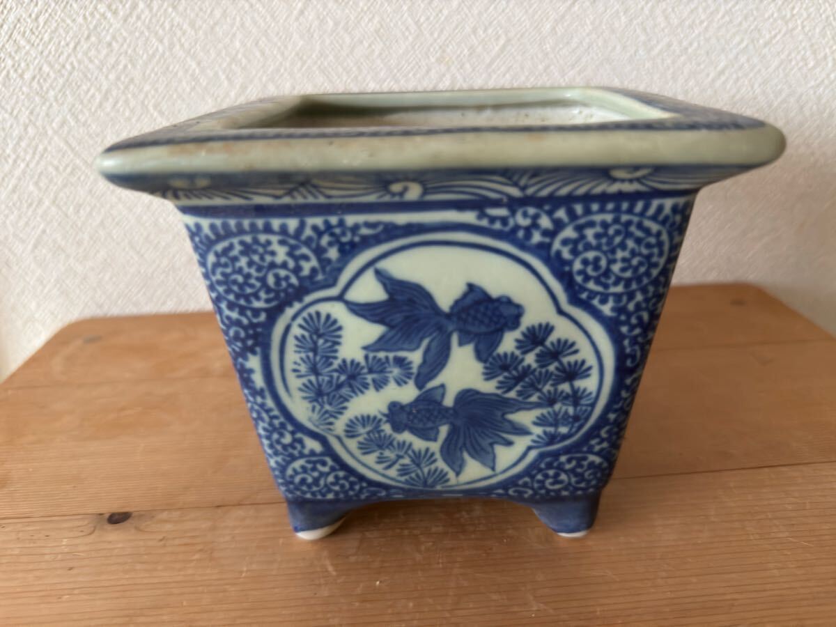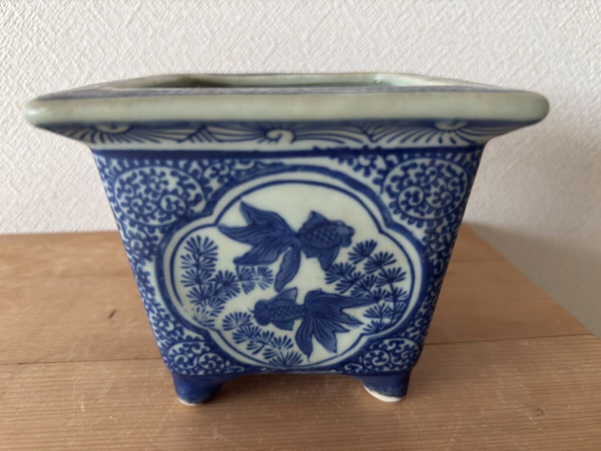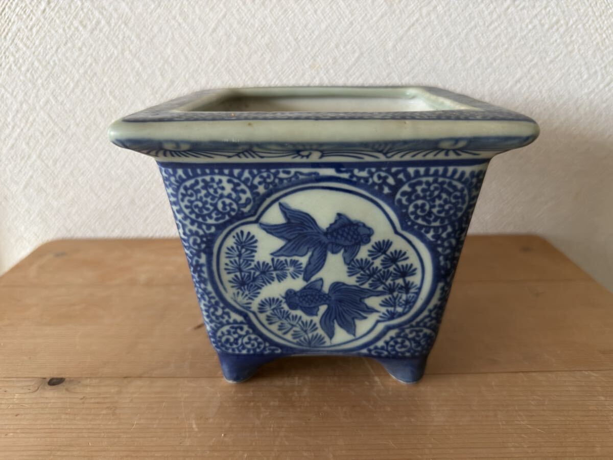 青と白の陶器製、金魚模様の四角形植木鉢。