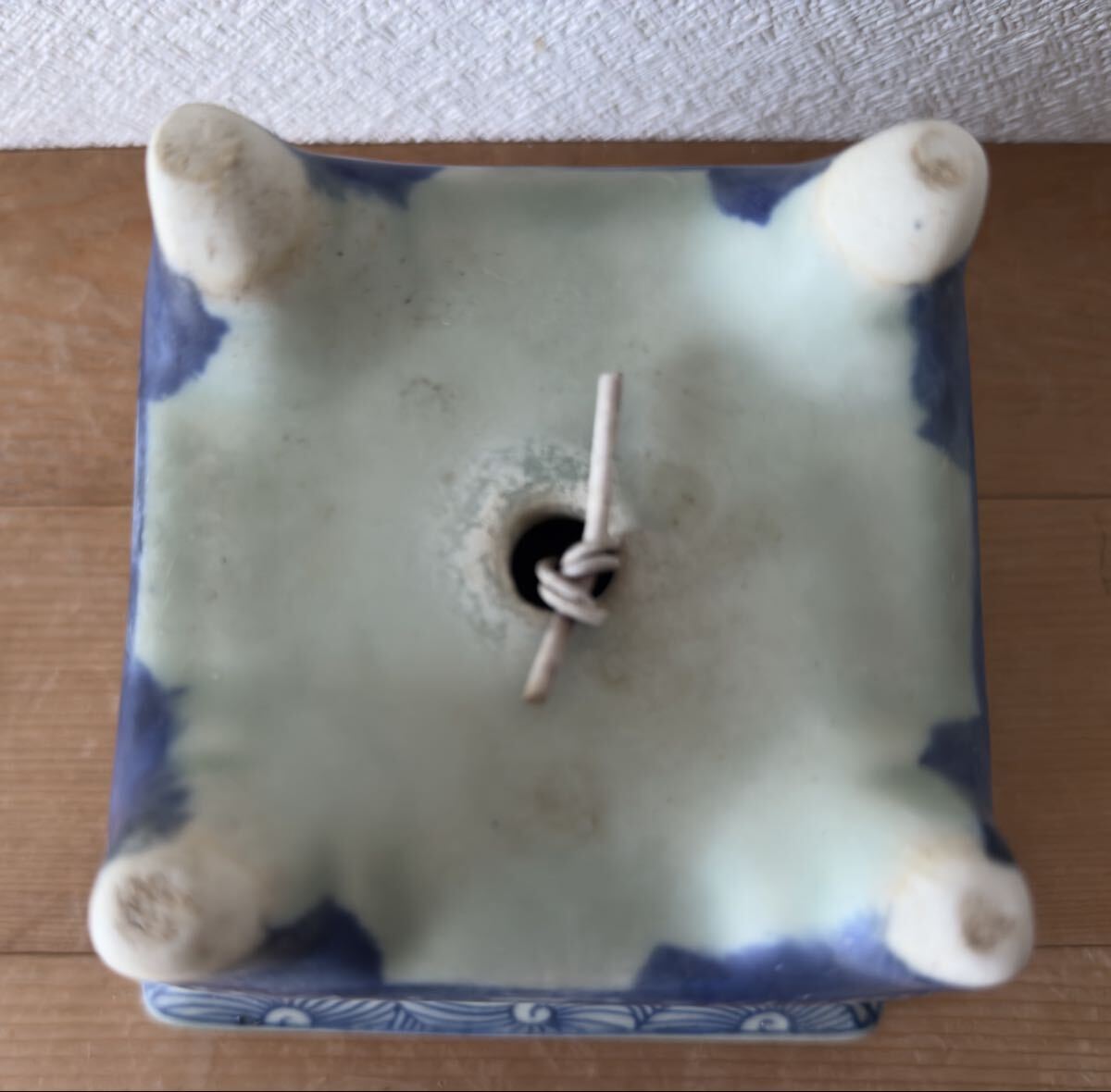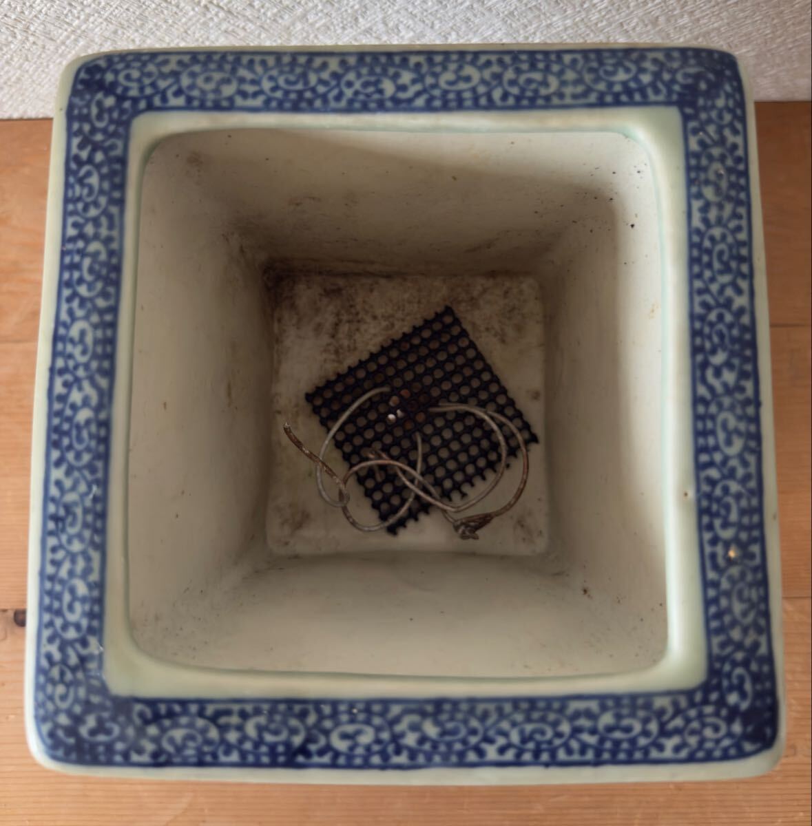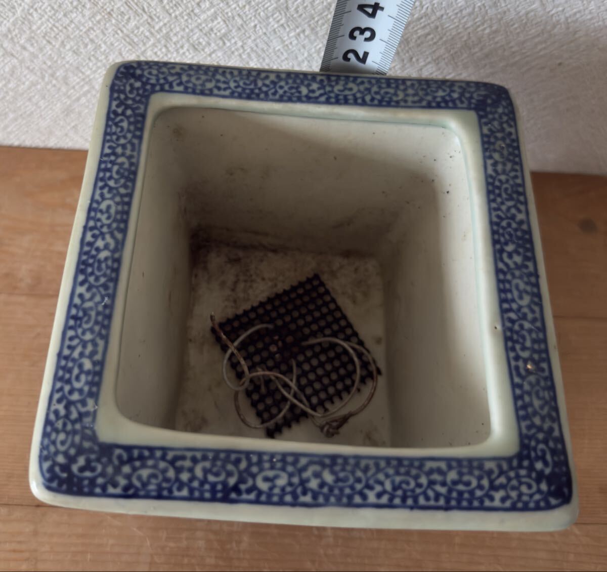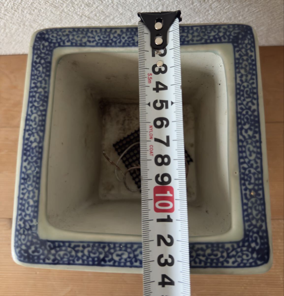 青と白の陶器製、金魚模様の四角形植木鉢。