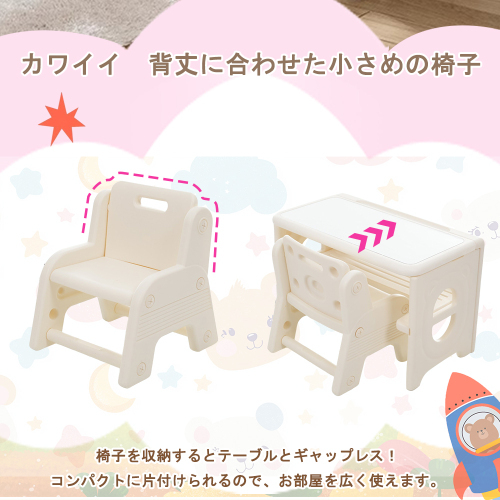 • 【カワイイ 背丈に合わせた小さめの椅子】椅子を収納するとテーブルとギャップレス!コンパクトに片付けられるので、お部屋を広く使えます。