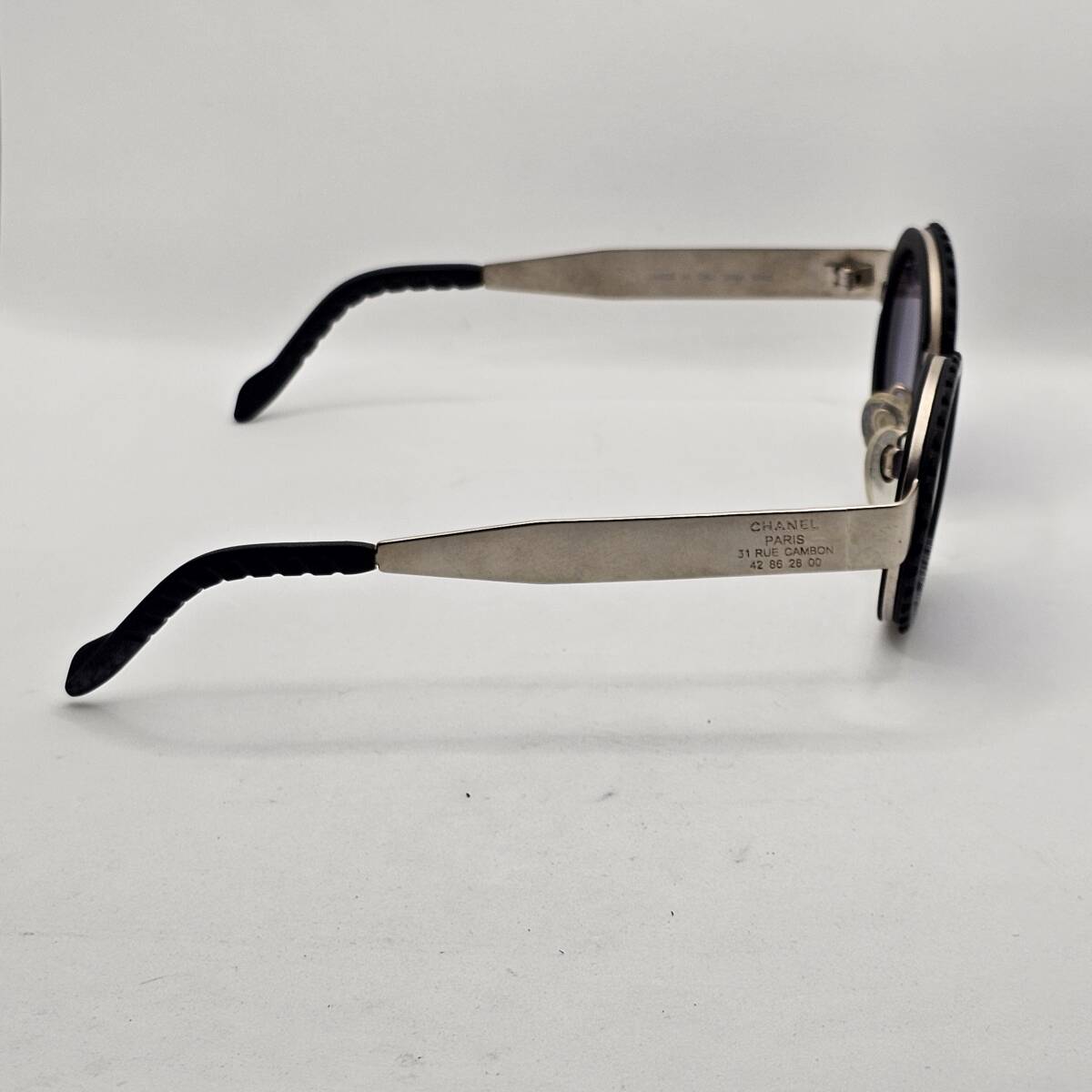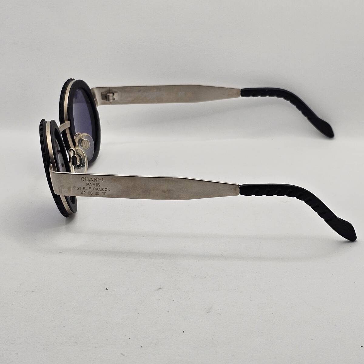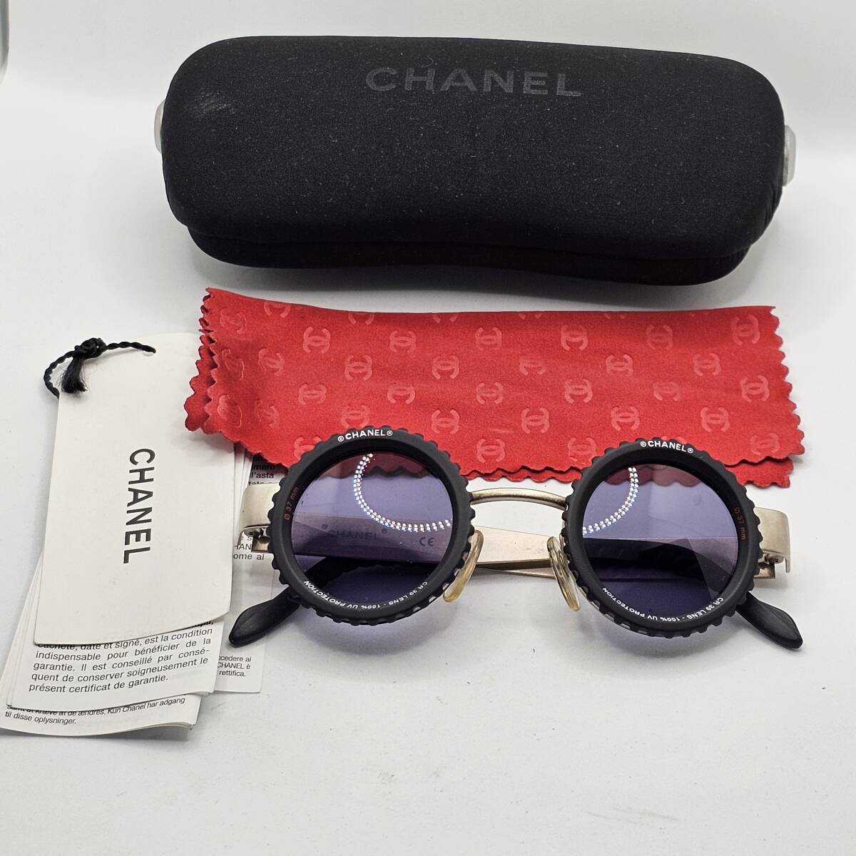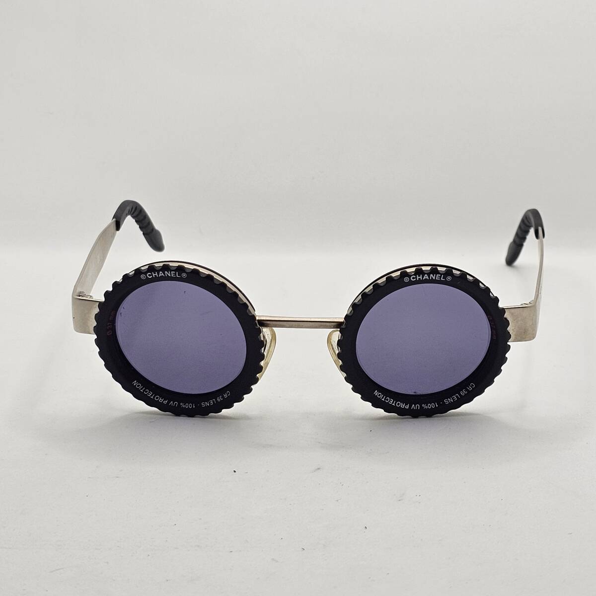 CHANELのラウンドサングラス、メタルフレームとブラック/パープルのレンズが特徴。