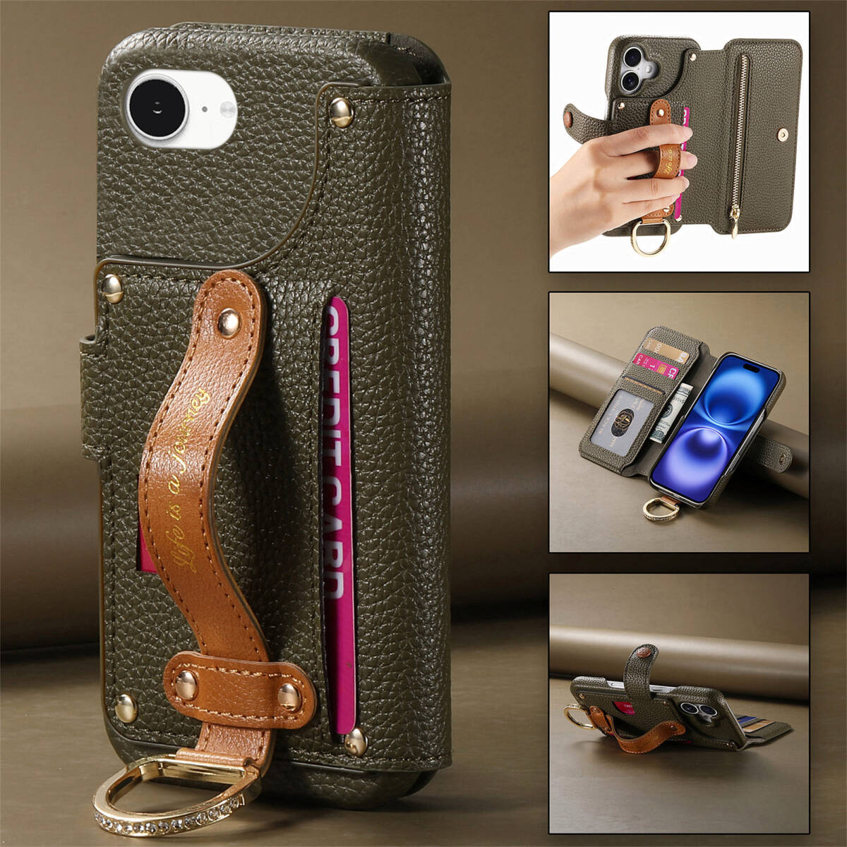 グリーン iPhone16E 用ケース 手帳型 RFID磁気防止 スキミング防止 カードポケット 落ち着いた色 横置き機能 高級PU 気質 全面保護