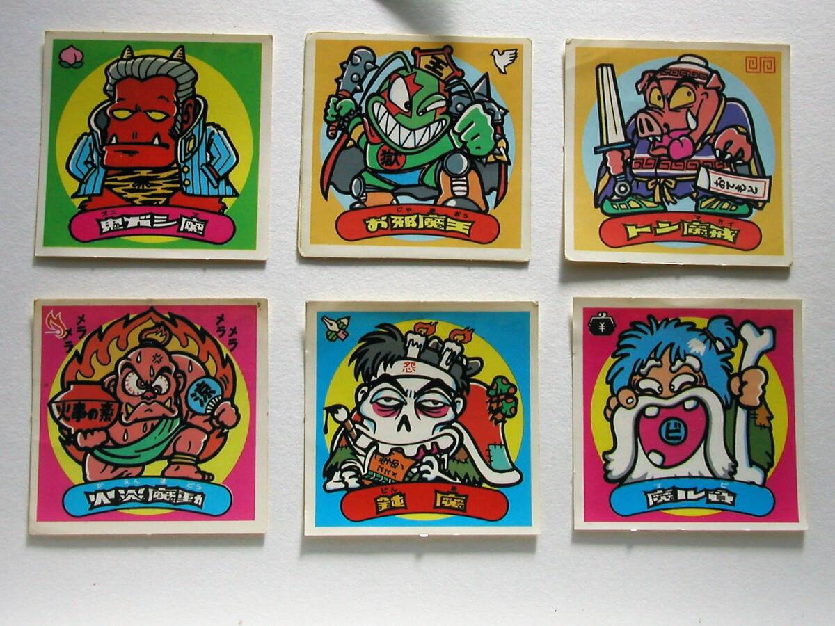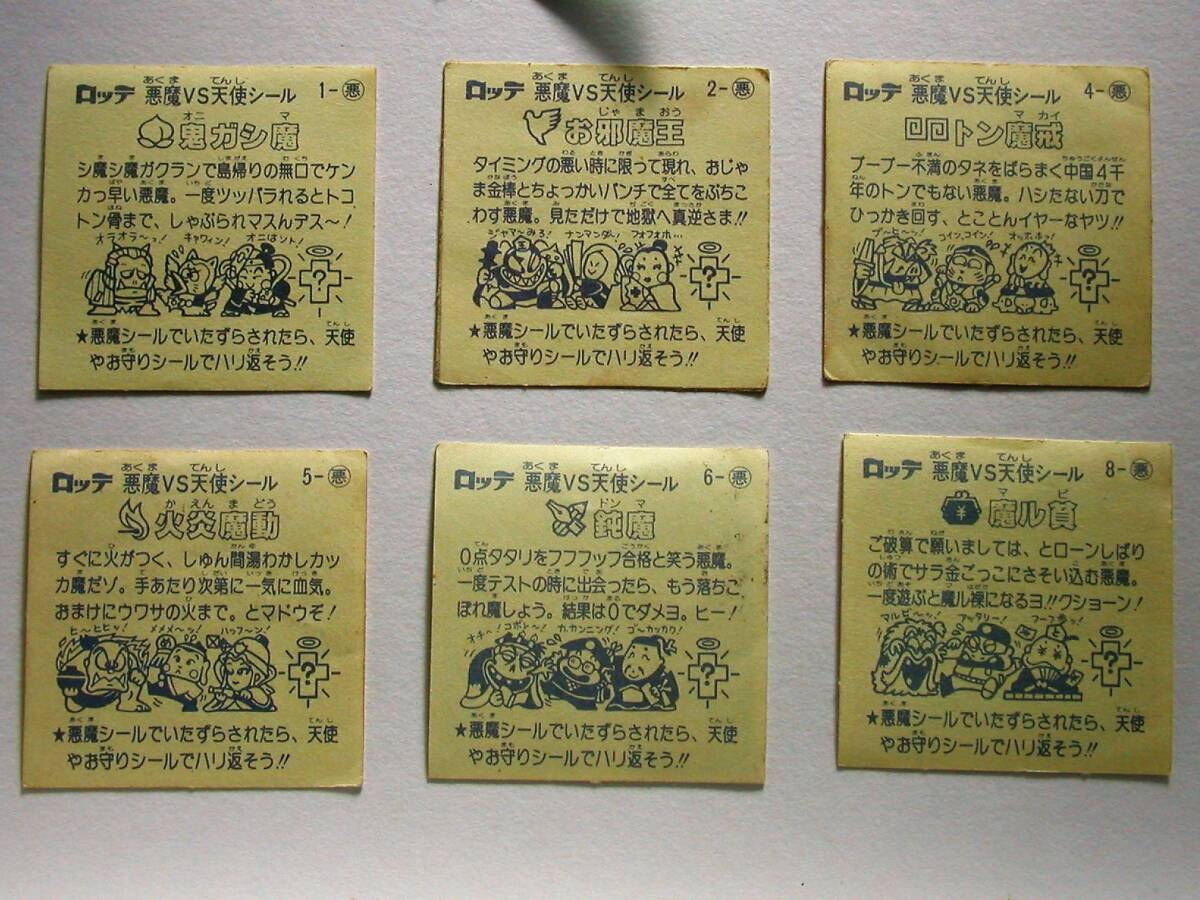 ロッテ ビックリマン 悪魔VS天使シール 1 鬼ガン魔 2 お邪魔王 4 トン魔戒 5 火炎魔動 6 鈍魔 8 魔ル貧の6枚です。