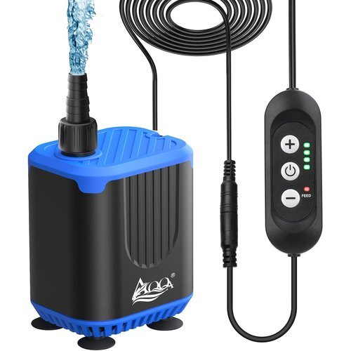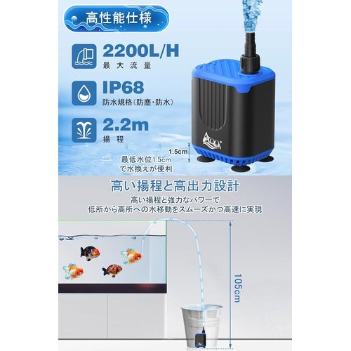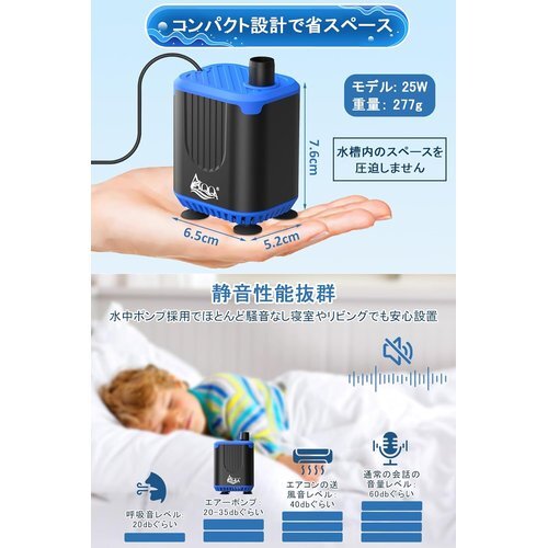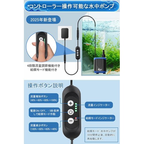 AQQA 水中ポンプ 小型ポンプ コントローラー操作可能 排水ポンプ 4段階流量調節 給餌モード機能 吐出量2200L/H 最大揚程2.2M 静音 IP68防水 循環ポンプ 給水ポンプ 水槽用ポンプ 電動水ポンプ 水族館給水 水槽水循環 水耕栽培 噴水  ブルー 25W  142