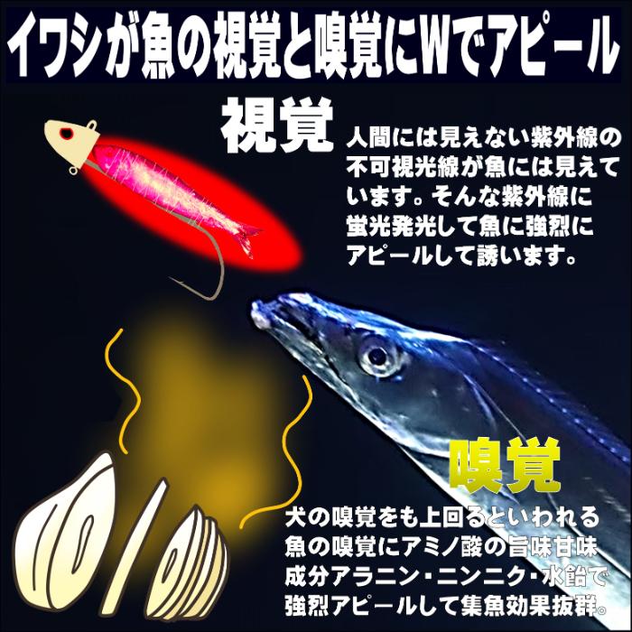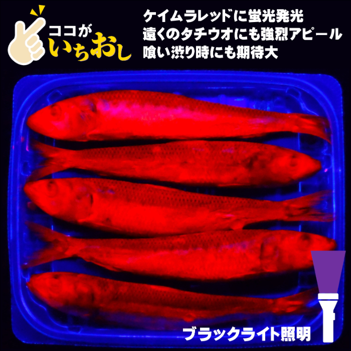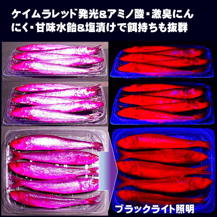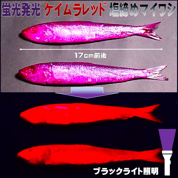 紫外線 蛍光発光 ケイムラレッド塩締めイワシが海中で蛍光発光して強烈アビールします。