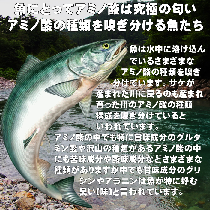 魚の嗅覚(味覚)は犬より優れているといわれるほど鋭く、中でもアミノ酸の旨味成分や甘味成分に良く反応します。