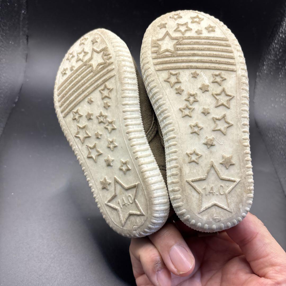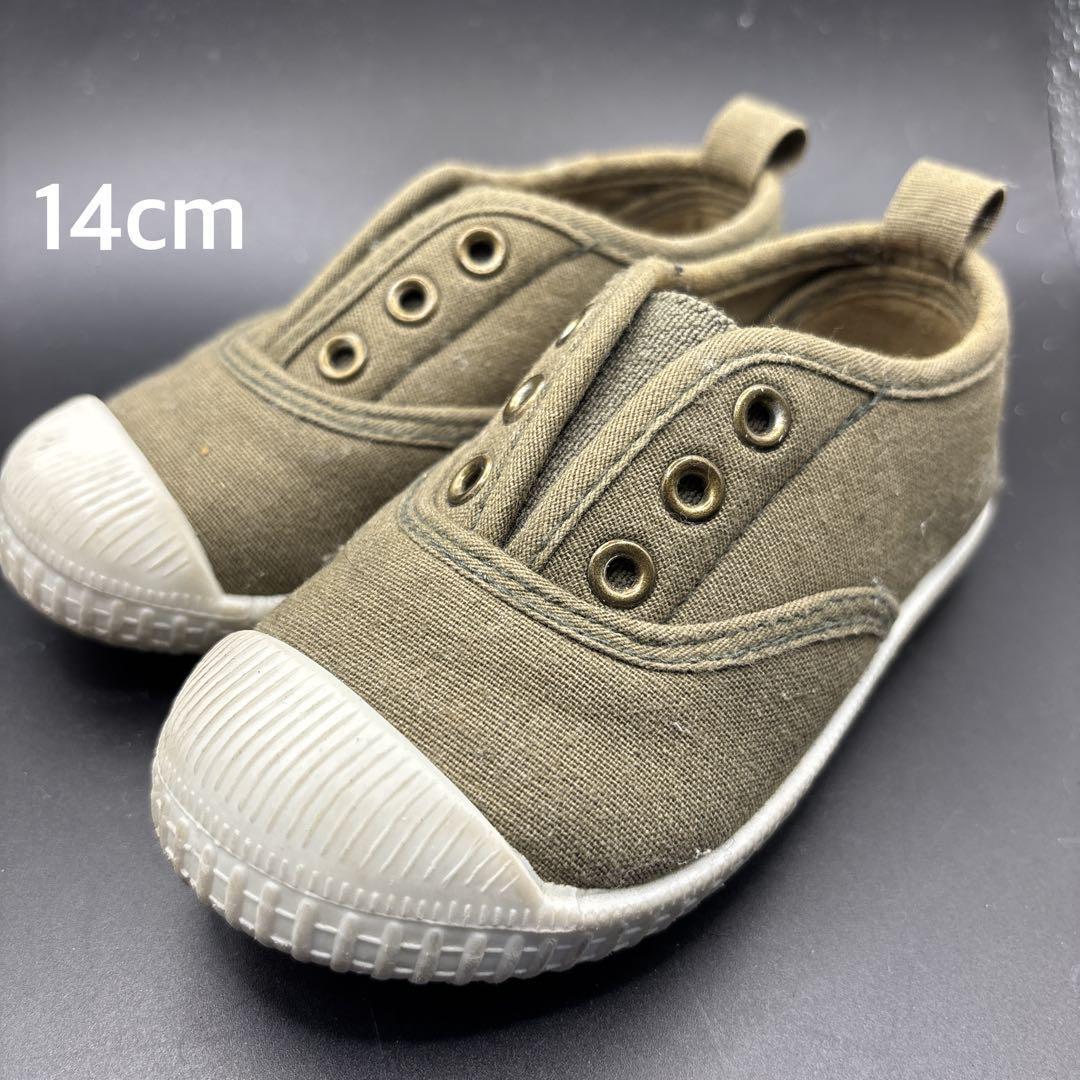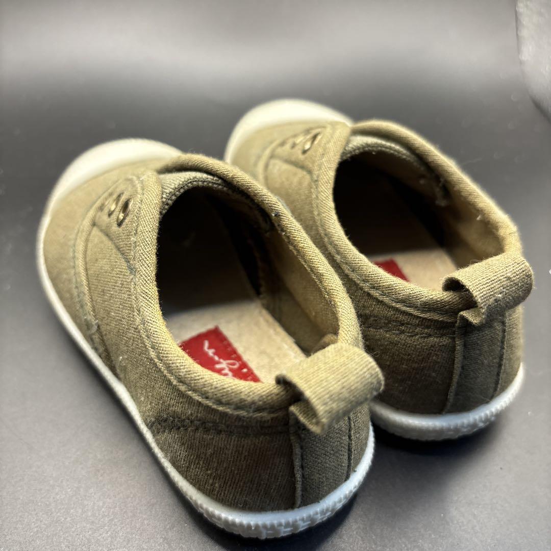 カーキのスリッポンデザイン、サイズ14cmのベビーシューズです。
