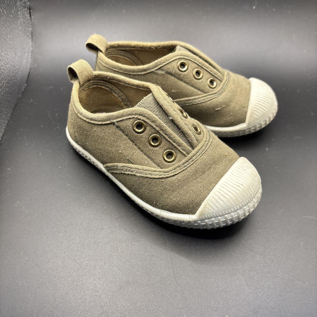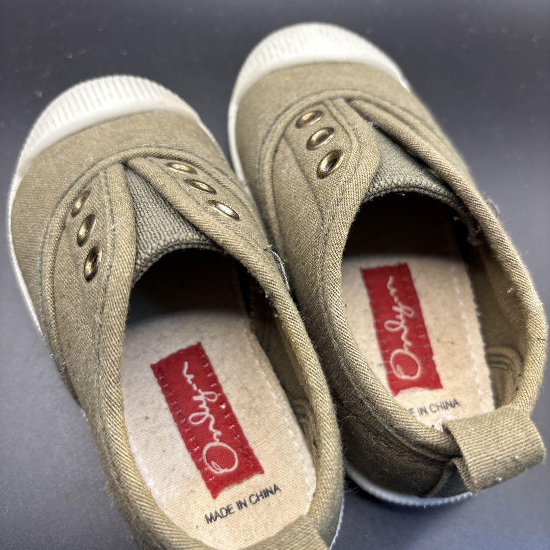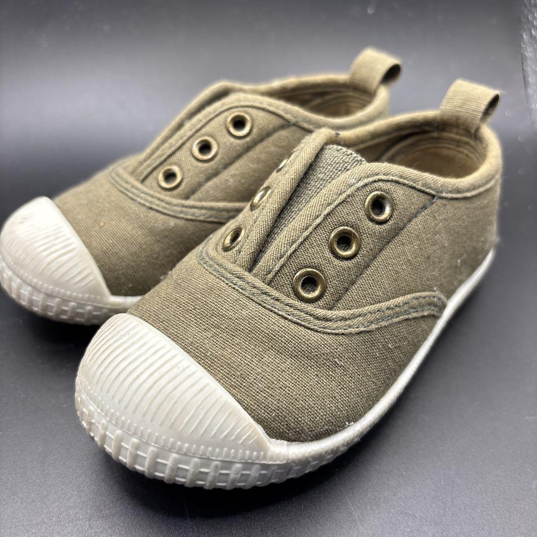 カーキのスリッポンデザイン、サイズ14cmのベビーシューズです。