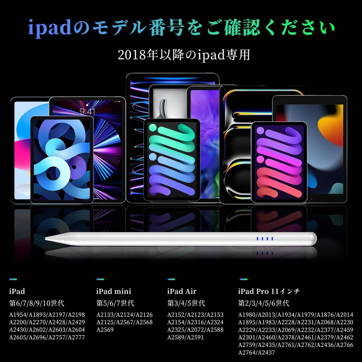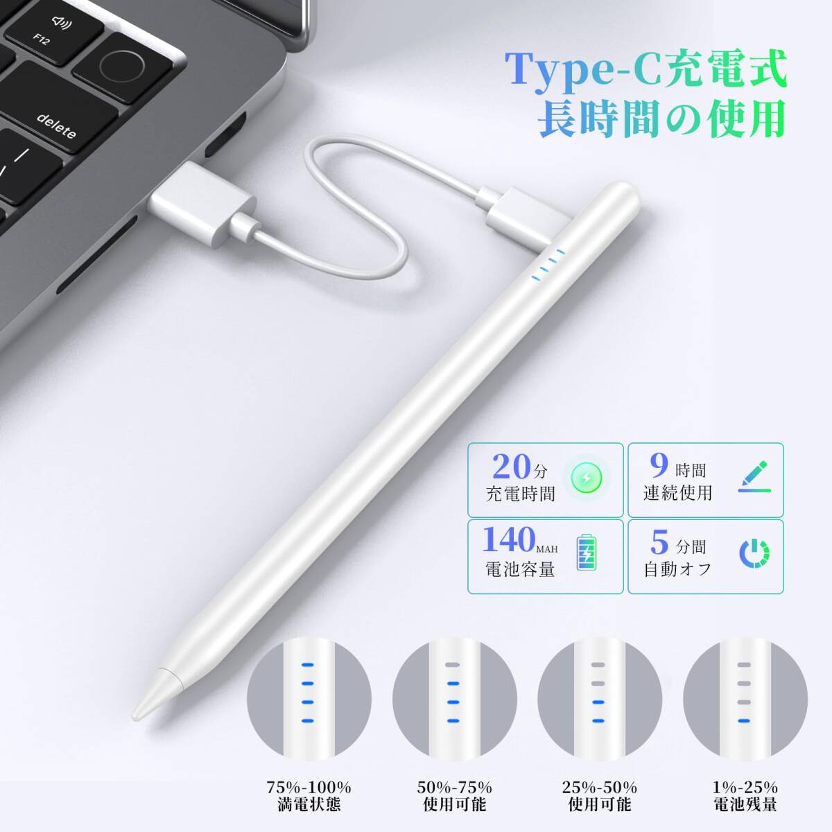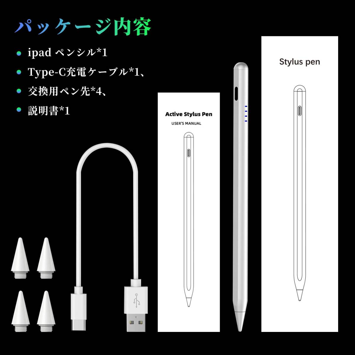 【2018年以降のipad専用ペン&品質】当社のアップルペンシル 代用は、apple pencil proと高い互換性を持っています。ご注意:このipadタッチペンを注文する前に、お使いのデバイスが互換性があることをご確認ください!このipad mini ペンシルの対応機種:iPad(第6/7/8/9/10世代/A16)、iPad mini (第5/6世代)、iPad Air(第3/4/5世代/M2/M3)、iPad Pro (第1/2/3/4/5/6世代/M4)。このアイペンシルについてご質問がございましたら、お問い合わせください。 パッケージ内容:ipad ペンシル*1、Type-C充電ケーブル*1、交換用ペン先*4、説明書*1
