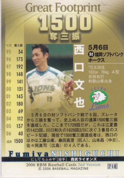 ●2006BBM/2nd【西口 文也】 サブ:通算1500奪三振 No.750:西武
