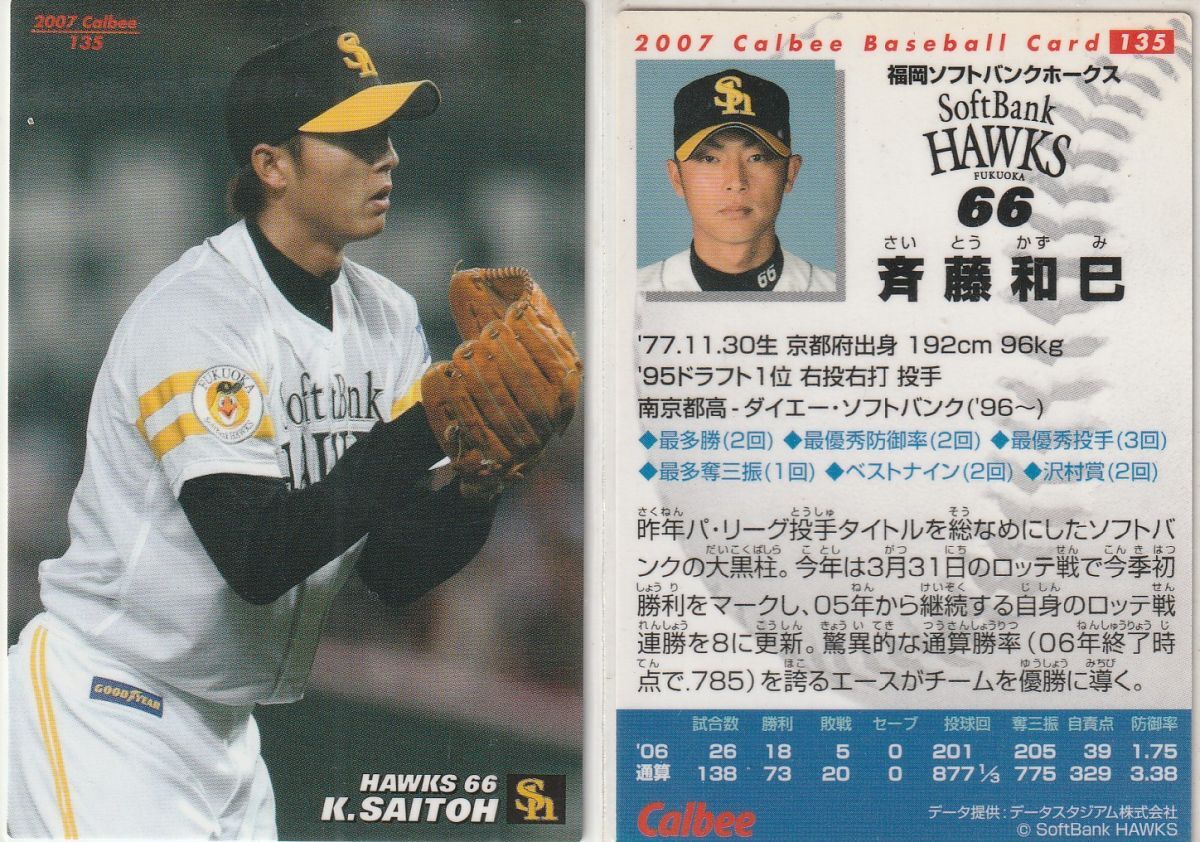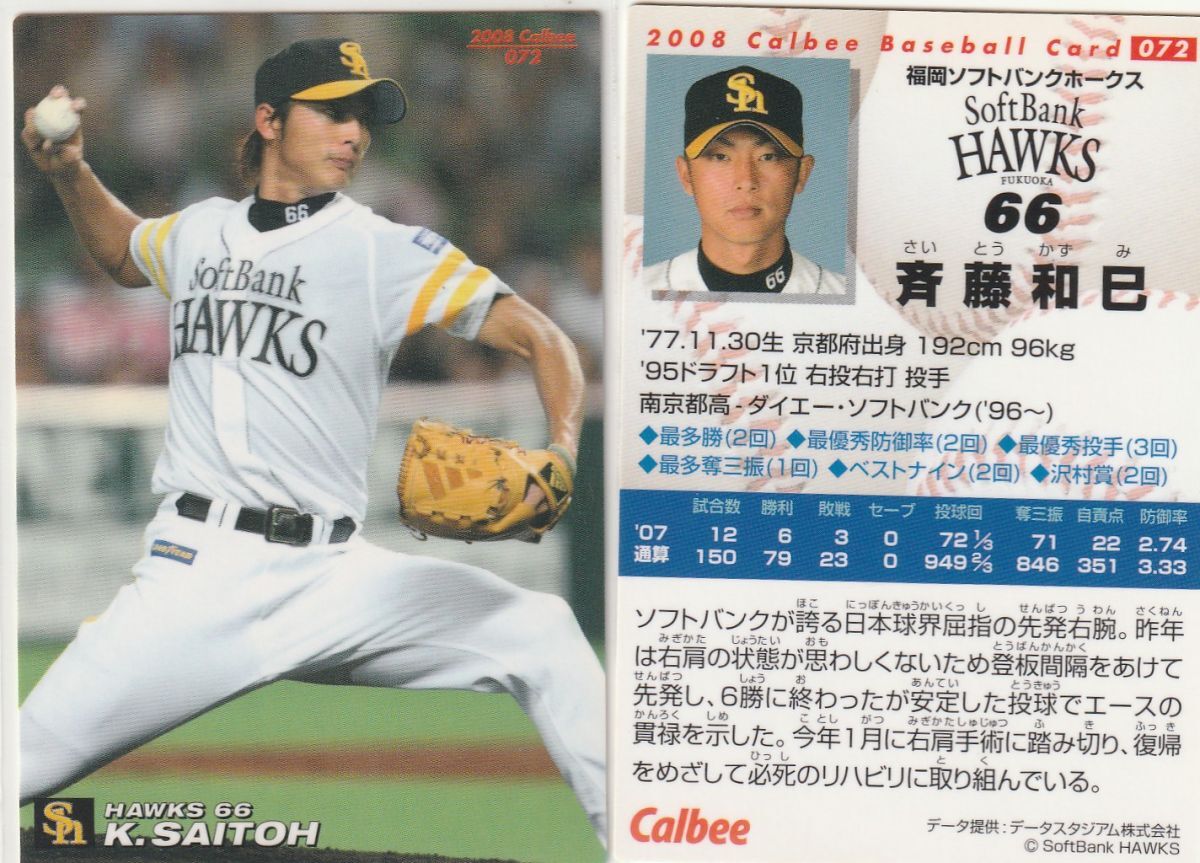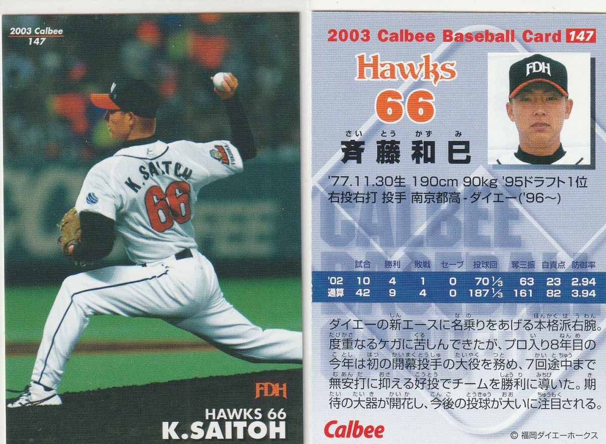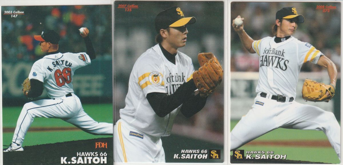 ●2003,07,08カルビー 【斉藤 和巳】 BASEBALL CARD 3種 No.147,135,072:ホークス R
