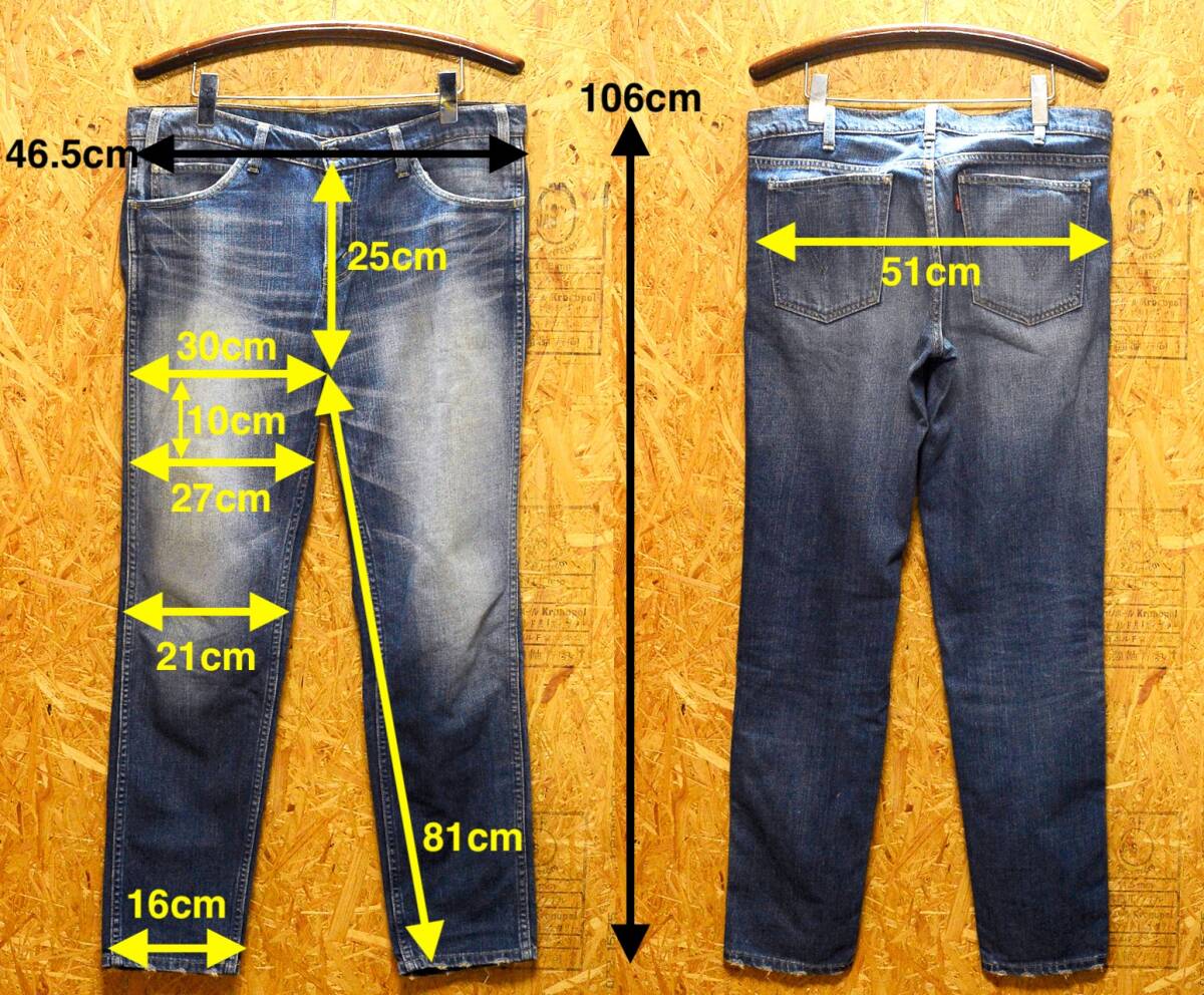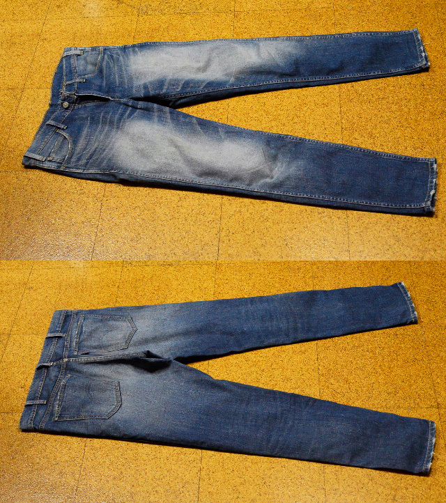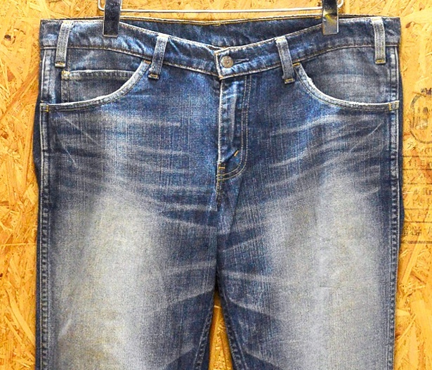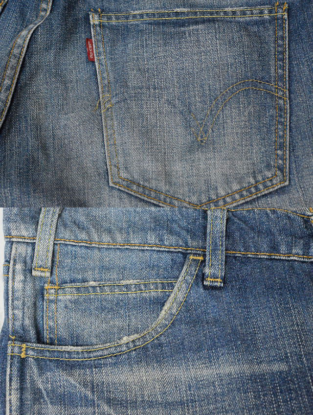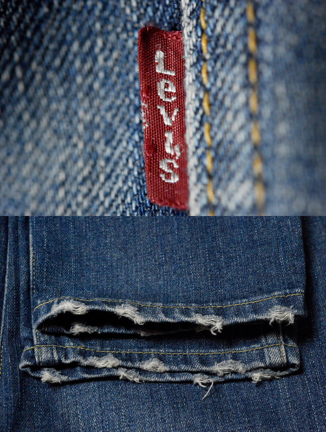 画像2  画像9 画像10(ジーンズが吊るされている画像)において稀にジーンズがよじれて歪んでいるように見える場合がございますが、これはリーバイスに使用されている右綾織デニム特有の「ねじれ」と呼ばれるもので、長期間穿き込まれ、洗濯を繰り返すうちに生じる生地の特性です。不良品、または使用されていた人の体型によるクセではございません。
