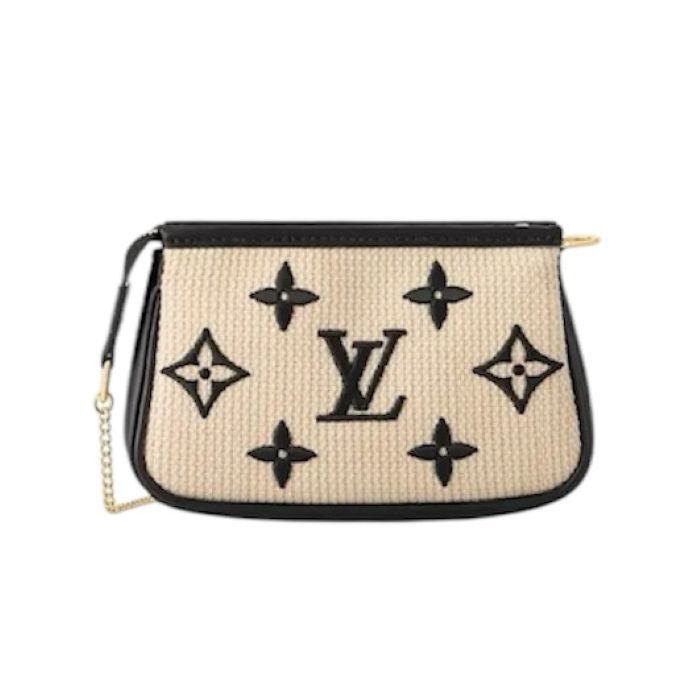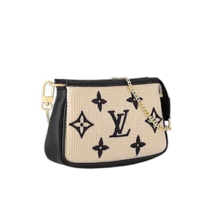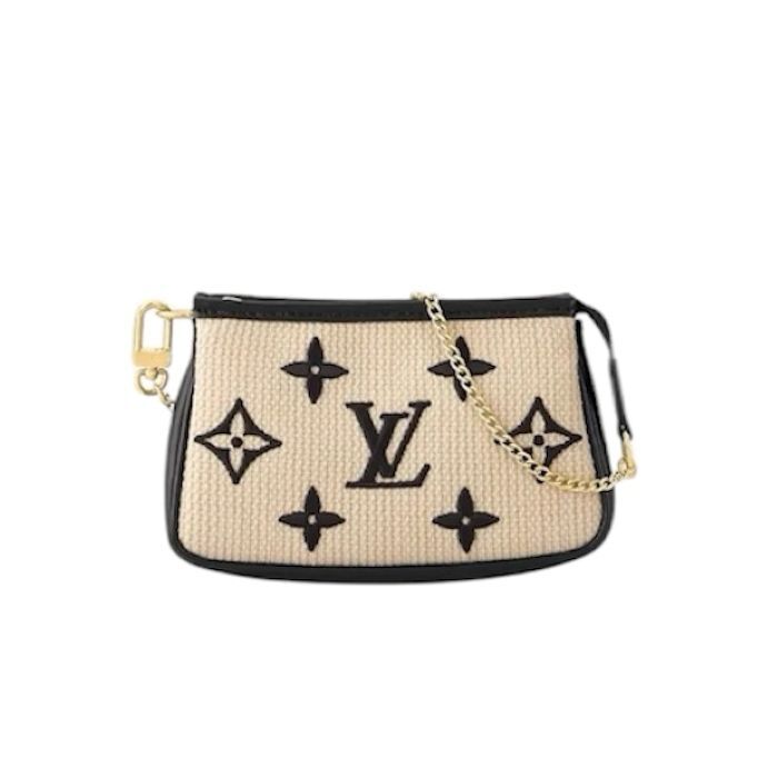 商品説明:ブラックのモノグラム・パターンをあしらったナチュラルコットンを使用し、同系色のレザーのトリミングを施した、洗練された雰囲気の「ミニ・ポシェット・アクセソワール」。ファスナースタイルの開口部で仕上げた、小物類の持ち運びにぴったりのミニサイズのポーチです。バッグやベルトに取付けられる、ゴールドカラーのスナップフックとチェーン付き。