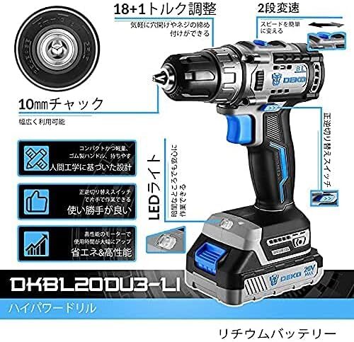 ファッション 充電ドライバー、20V、2バッテリー付、ハイパワー、コードレス、最