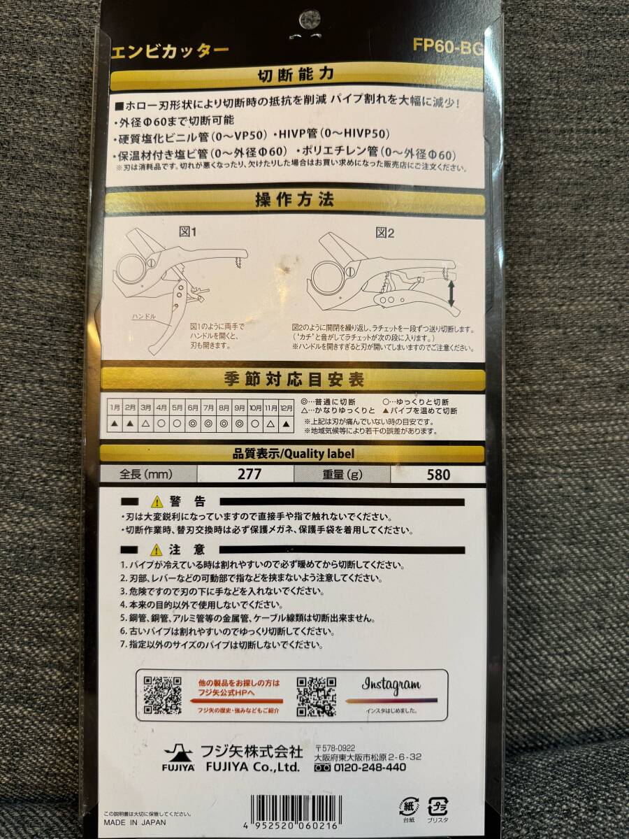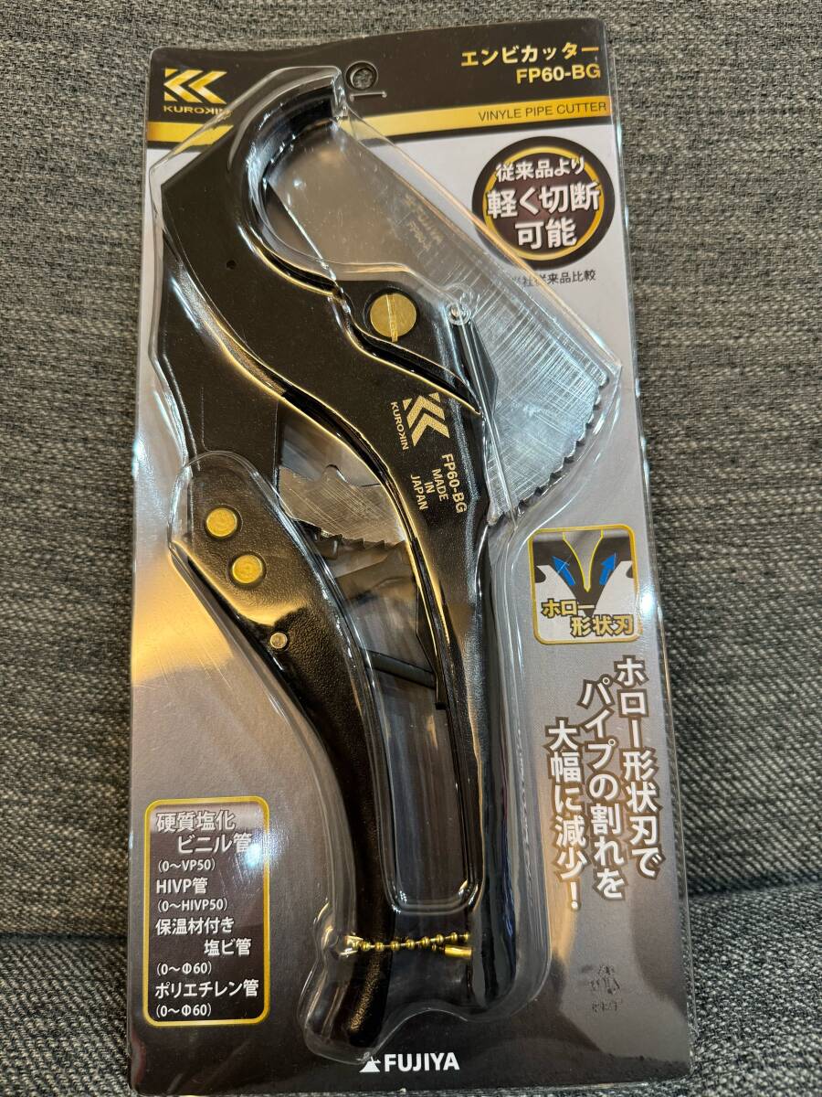 フジ矢・KUROKIN/FP60-BG /エンビカッター(黒金) <品名> 黒金シリーズ 塩ビ管カッター 【特徴】 ・特徴:ホロー形状刃により切断時の抵抗を軽減し、パイプ割れを大幅に減少 ・切断能力:硬質塩化ビニル管 ~VP50、HIVP管 ~HIVP50、保温材付き塩ビ管 ~外径φ60、ポリエチレン管(PE等) ~外径φ60 ・全長:277mm、重量:580g ◆詳細はメーカーホームページをご参照ください。 ◆ノークレーム、ノーリターンでお願い致します。 ◆神経質な方の入札はご遠慮下さい ◆落札後24時間以内の取引開始、2日以内にご入金出来る方のみの入札をお願いします。