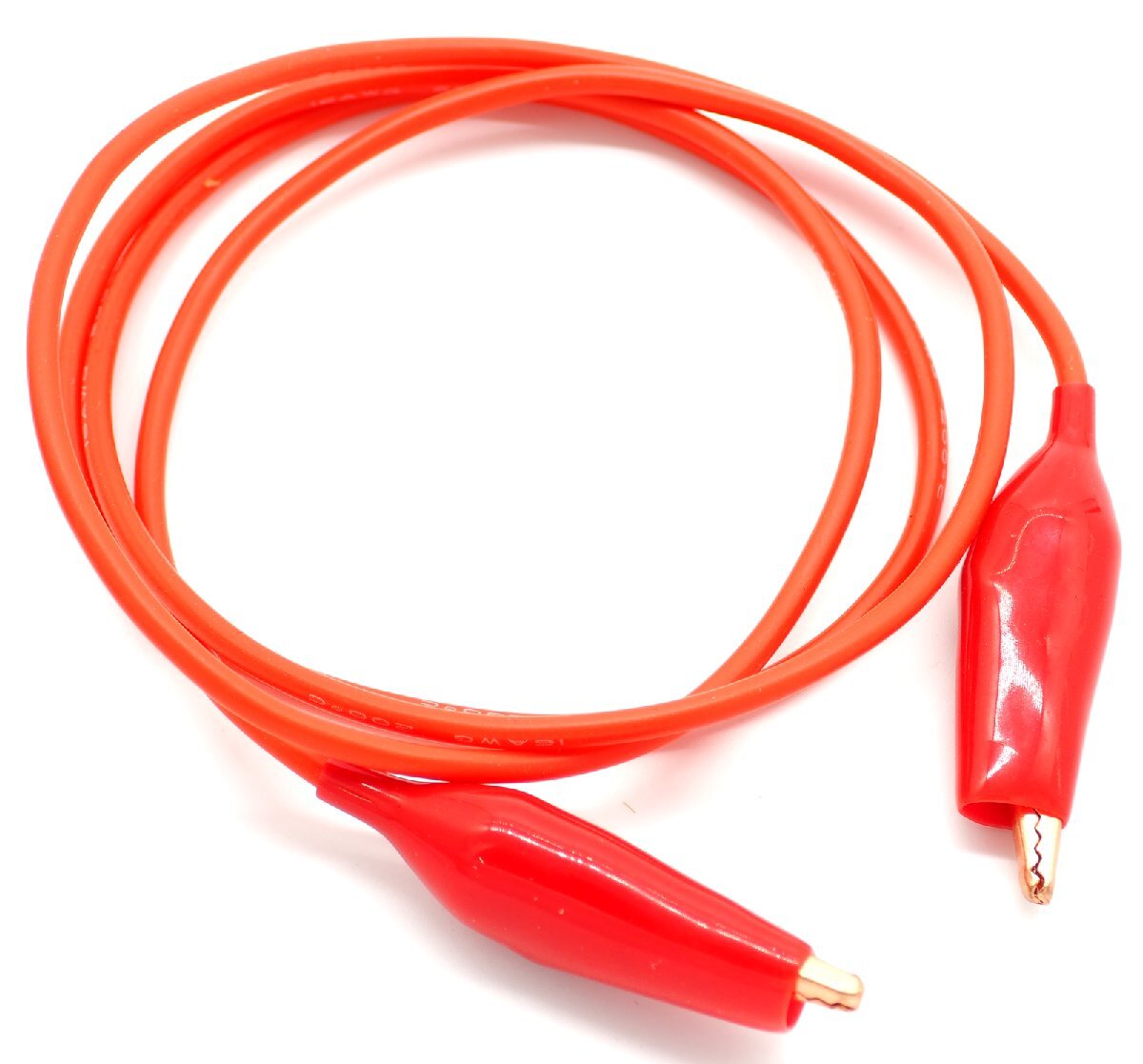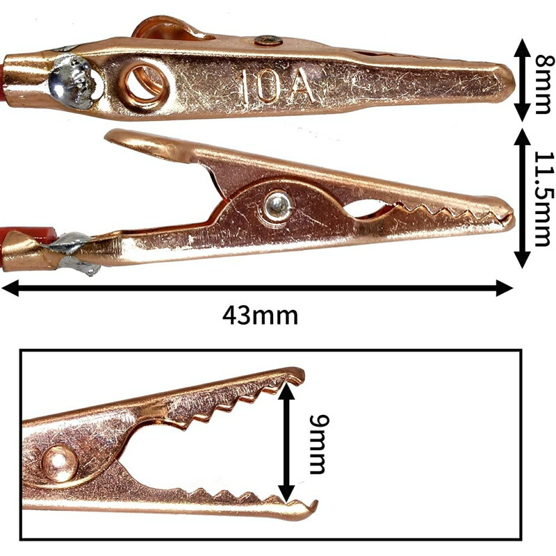 〇全長(約) 100cm(クリップ部含む)〇ケーブル径 3mm 16AWG 〇ワニ口開口部 最大 9mm 〇最大電流 10A