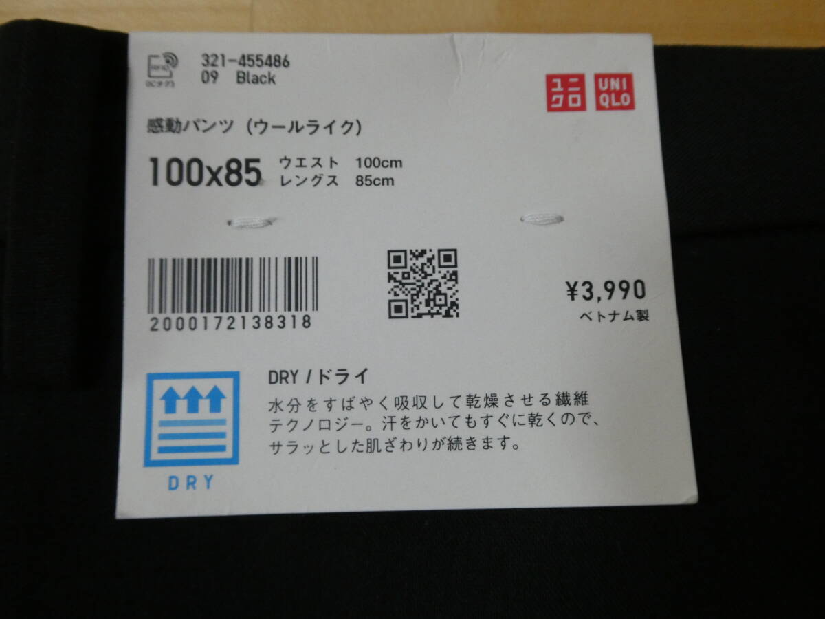 351.UNIQLO ユニクロ メンズ 感動パンツ ウールライク ブラック 321-455486 ウエスト100cm 新品未使用品 送料無料