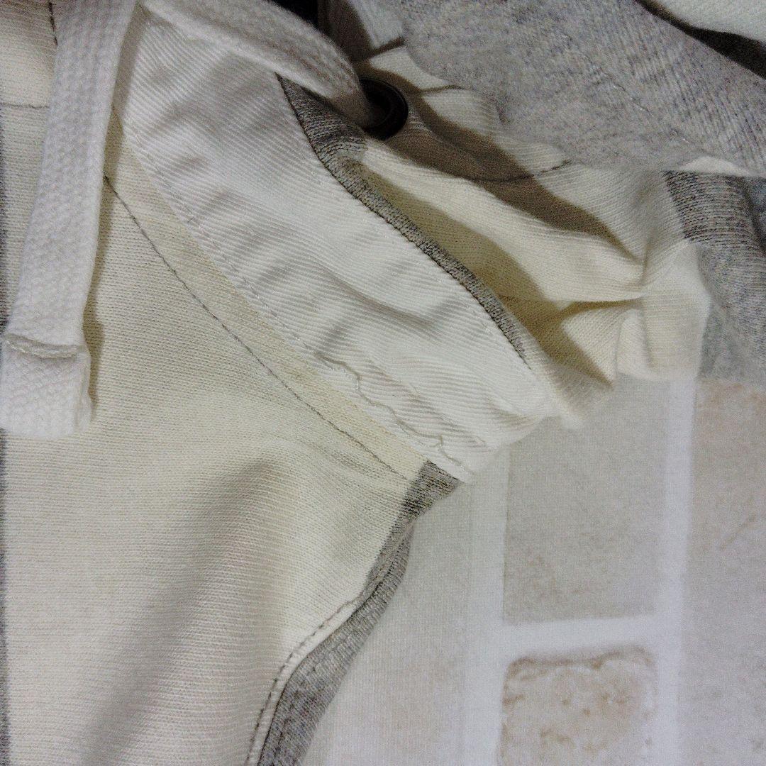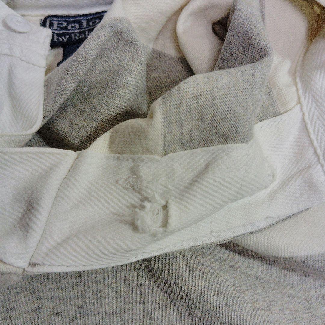 襟元、ボタンにほつれ、襟に縫われた跡があります。