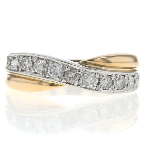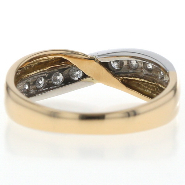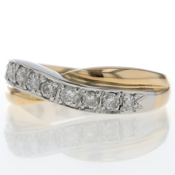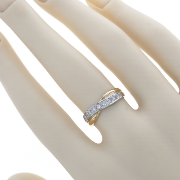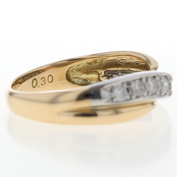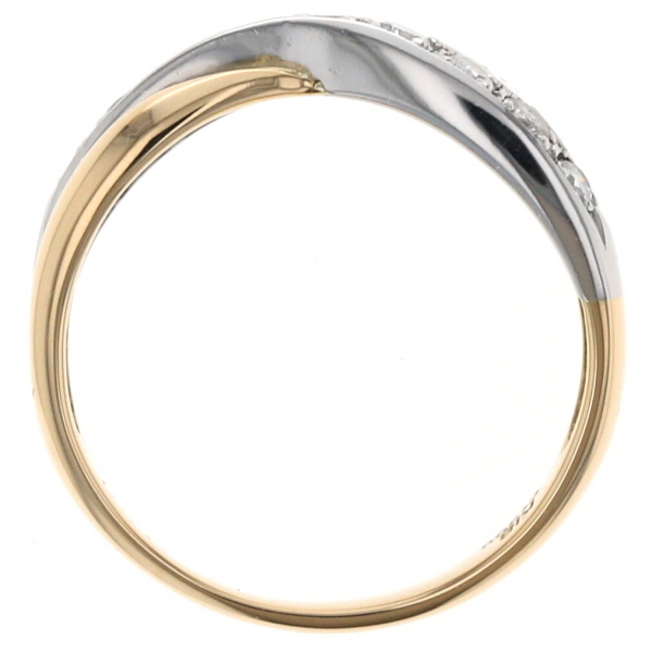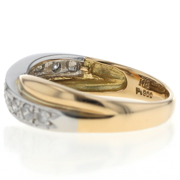 | 商品紹介 | イエローゴールドとプラチナの美しいコンビネーションが魅力のリングです。 クロス描くアームがエレガントな雰囲気を演出し、プラチナ部分に沿ってセッティングされたダイヤモンドが美しい輝きを放ちます。 |