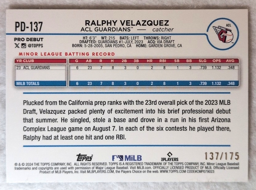 ★175枚限定★ RALPHY VELAZQUEZ GUARDIANS 137/175 TOPPS PRO DEBUT 2024