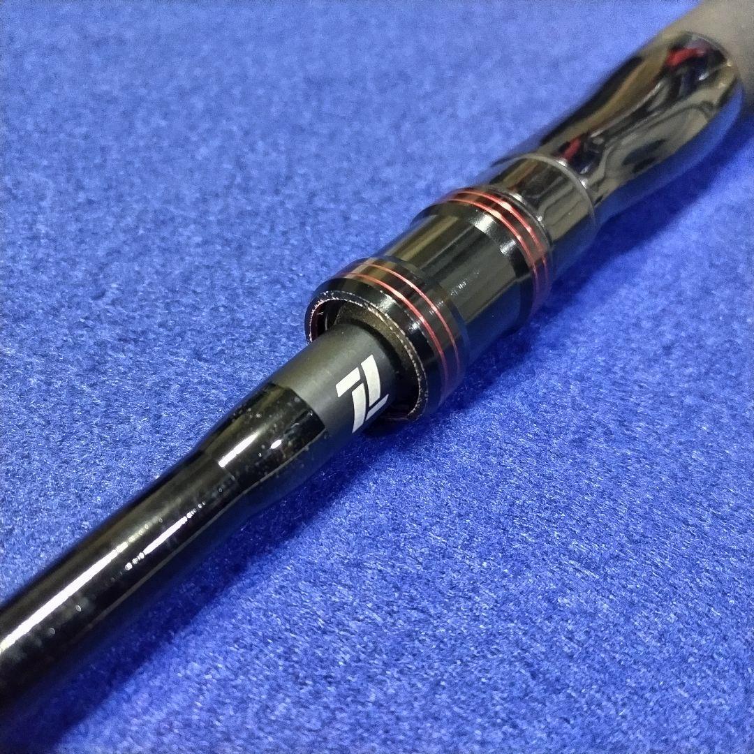 リールシート周りのロゴとブラックメタルパーツ、赤ライン、そこから続くストレートグリップがコンパクトにまとまった美しいショートロッドです。