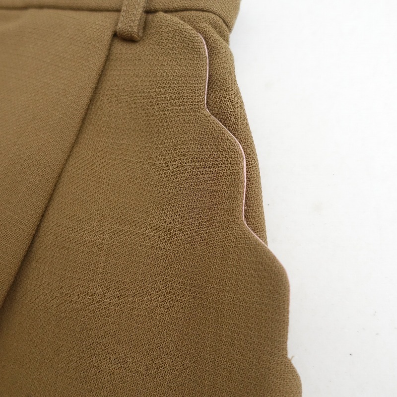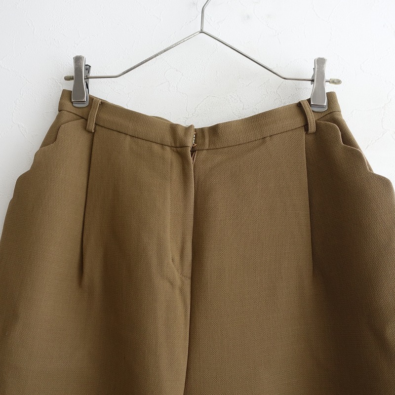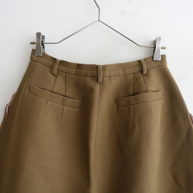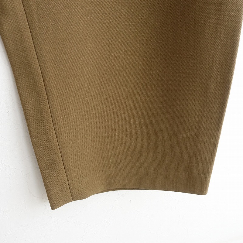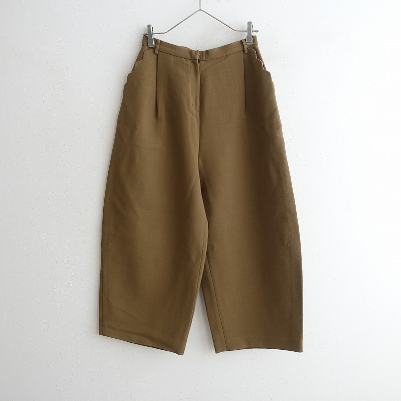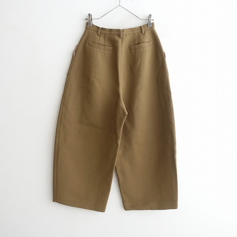 leur logetteのウールタックセワイドパンツです。カラーはキャメル×ピンクです。強撚糸の細番手ウールの糸で甘く織りたてられたダブルクロス生地を使用。シャリ感があり、透け感はなく、中厚でシワになりにくく、通気性の良い独特な織り目が特徴的な素材です。前立てはジップフライ、フック仕様。フロントにタックを配したワイドパンツです。ヒップに箱ポケット、前両腰にシャンパンピンクの内布を配したスカラップカットのポケットがございます。 |