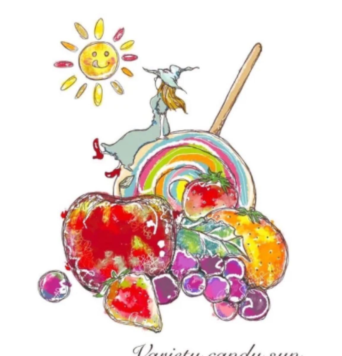 虹とキャンディ、太陽のイラストが印象的で、まるで夏の絵本の1ページのよう。
