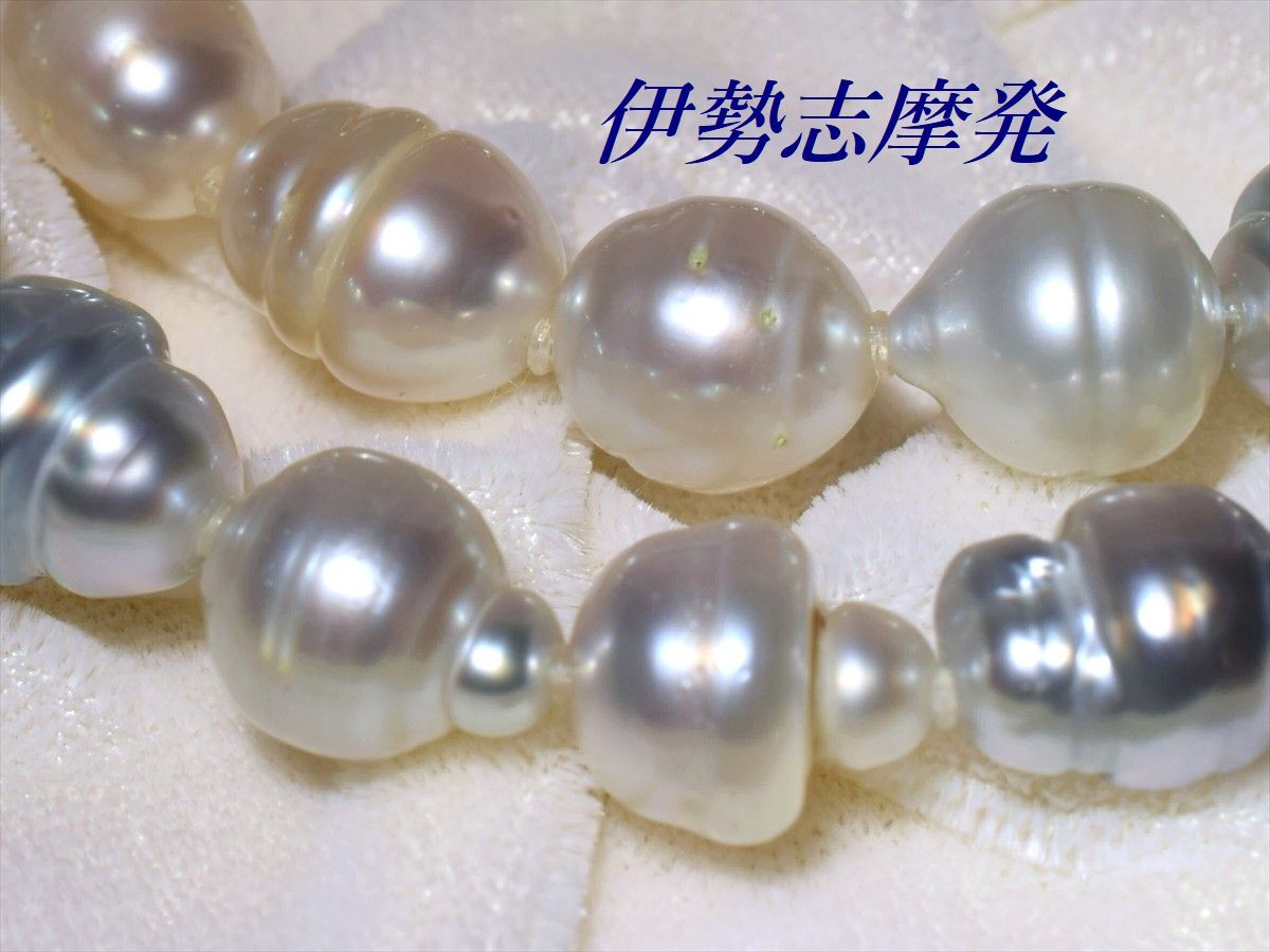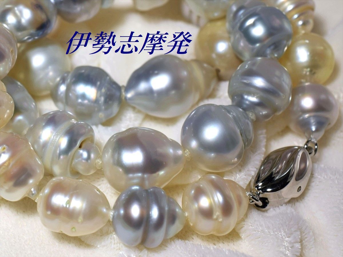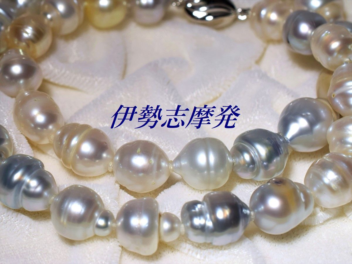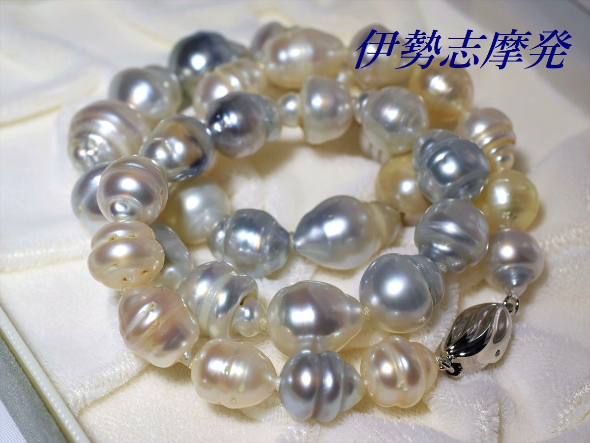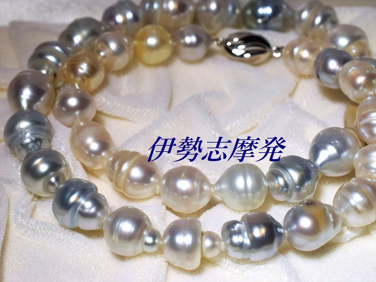 【真珠の種類】 南洋白蝶ナチュラル真珠 【珠サイズ】 センター13,07㎜x14,5㎜-端の小さな珠9,1㎜x10㎜up 【珠の形状】 バロック珠 【色】 ホワイトシルバーブルーグレー優しいゴールドなど 【巻き】 非常に良い◎ 【照り】 非常に良い◎ 【キズ】 バロック珠 【エクボ】 バロック珠 【金具の材質】 ロジウムシルバーワンプッシュ 【デザインの大きさなど】クラスプを含む全長44cm ◆重厚な高級感!自然が生み出す神秘の宝石、養殖期間が長いことから巻きが厚くなり、柔らかい輝きを生み出しています。◆ 自然の神秘を感じるサークル珠、ゴージャスなボリューム感と格調の高さが魅力の、南洋ナチュラル白蝶バロック大珠ネックレスは、一つとして同じ形がない自然が作り出す個性豊かなフォルムです。 カラーはホワイトベースに透明感のあるブルーや中にはゴールドの差すさまざまな色が表情を豊かにするパールです。シルバーがかったグレイッシュな珠には、ノーブルな魅力があります。 個性が光る唯一無二の存在感、とても艶照りの良い珠です。バロックシェイプゆえの表面の凹凸があるからこそ引き出せる、干渉色の豊かさ!天然キズがあるということは、自然の中で時間をかけて育まれた本物の真珠であることを表します。 また真珠の核は真円であるため、変形している真珠は、それだけしっかり海で育てられ、真珠層の巻きが厚いという証拠でもあります。 珠と珠の間には瑕つき防止のシリコンを挟んだ丁寧な作りで、着け外しも簡単なワンプッシュクラスプ仕上げです。 線状の溝模様のあるサークル、味わいのある大粒バロック珠がワンランク上のカジュアルスタイルを演出いたします。 上品な輝きを持つ本物のパールジュエリーは、特別な日の装いにもふさわしい存在です。 普通の真珠ジュエリーでは物足りない方や、洗練されたスタイルと個性的なデザインが特徴のモード系を好む方にお奨めのジュエリーです。 | ||||||||
