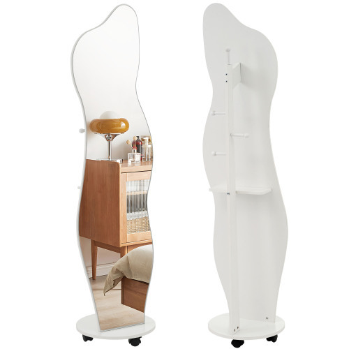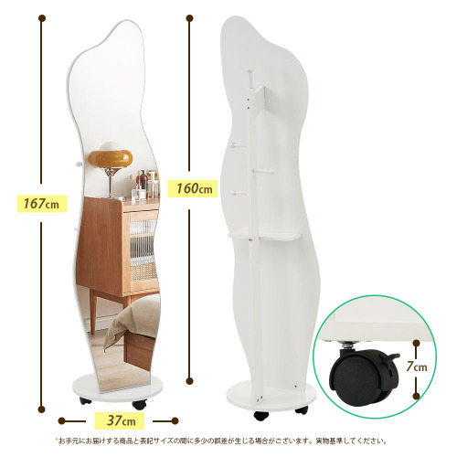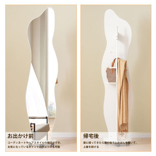 全身鏡 姿見鏡 ハンガーフック イレギュラ ハンガーフック付き鏡 ハンガー 360°回転可能なキャスター付き 北欧 収納付き 衣類収納