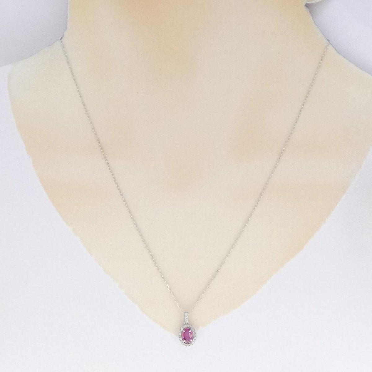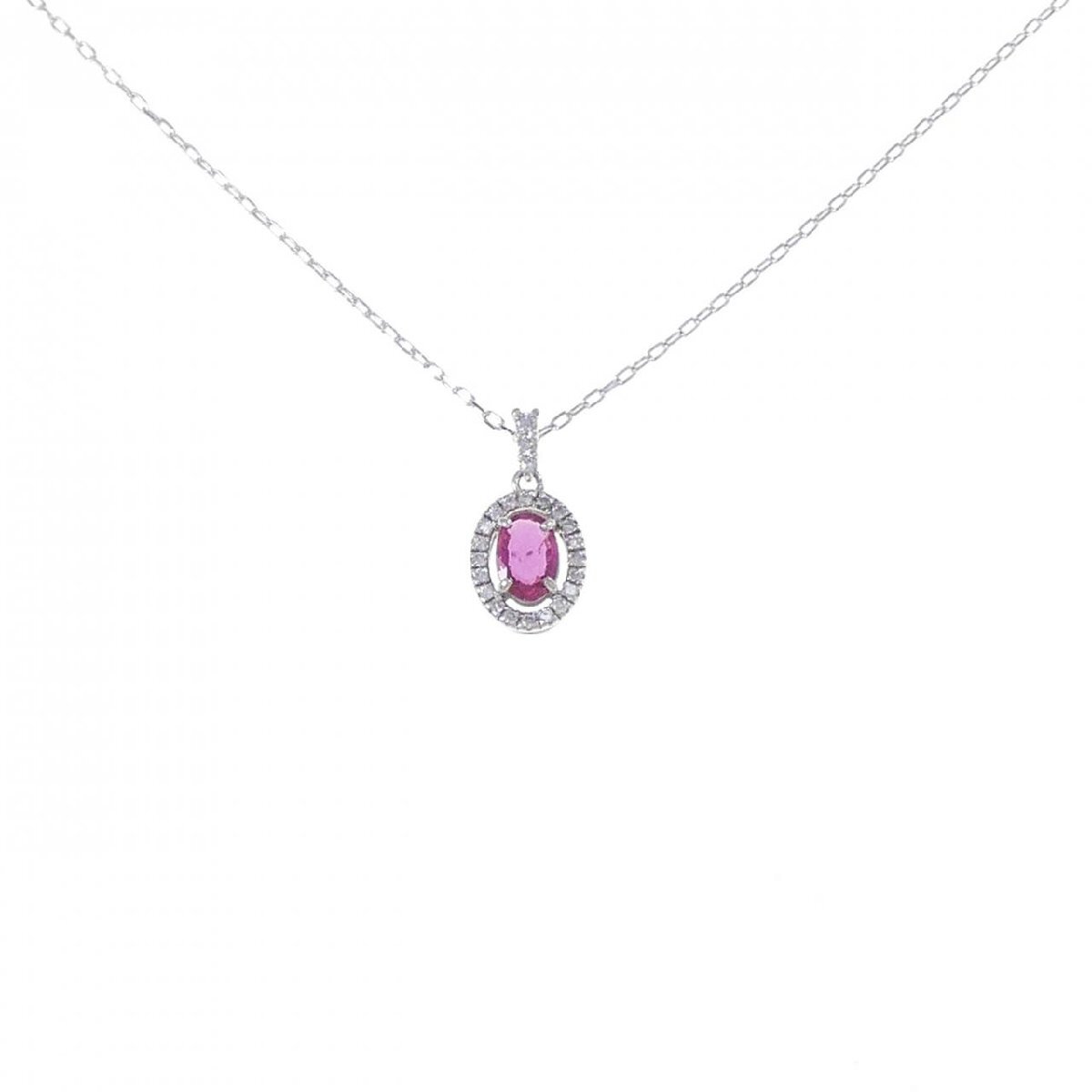 わずかにピンクがかった優しい赤色が佇むネックレス。ルビーの周りをダイヤモンドが囲む上品なジュエリーです。