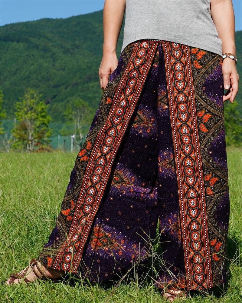 大人気のラップパンツ!!大人エスニックな雰囲気まん点のピーコックデザインです♪足をぐるっと一周巻いたようなおしゃれで動きやすいワイドシルエットです。軽やかな生地がひらりと揺れ、歩くたびさり気なく足元を覗かせるおしゃれなデザイン。ウエストは前すっきり・後ろシャーリングの優しいフィット感で、幅広いサイズの方にお楽しみいただけます♪素材には暑い時期でもさらっと快適肌ざわりのレーヨン生地を使用しています。