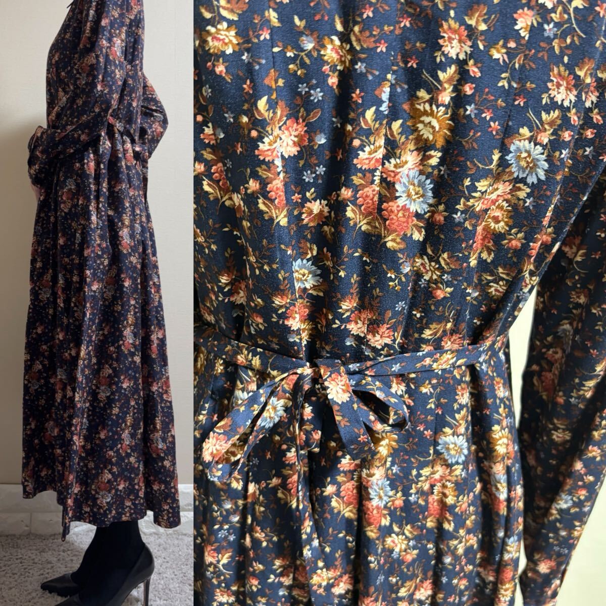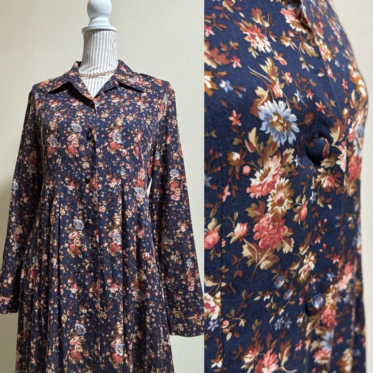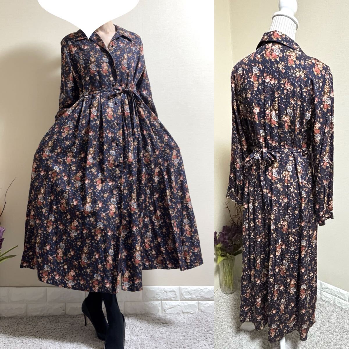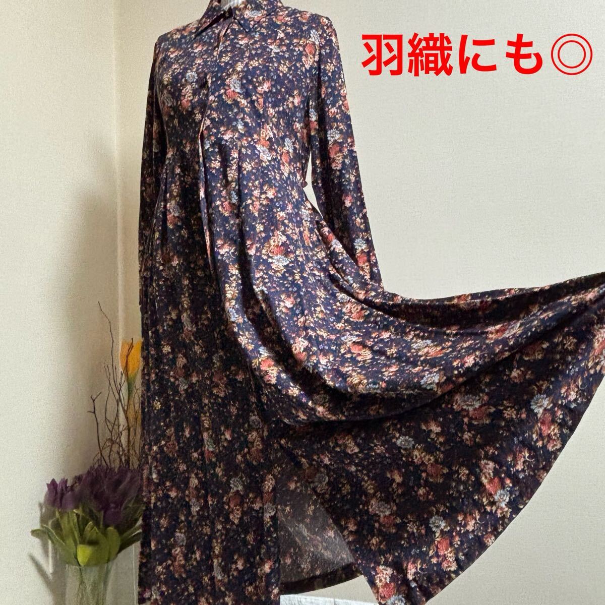 開襟デザインにもステンカラーにも出来るフローラル 花柄 アンティークフラワープリント 長袖ロングフレアワンピースです。