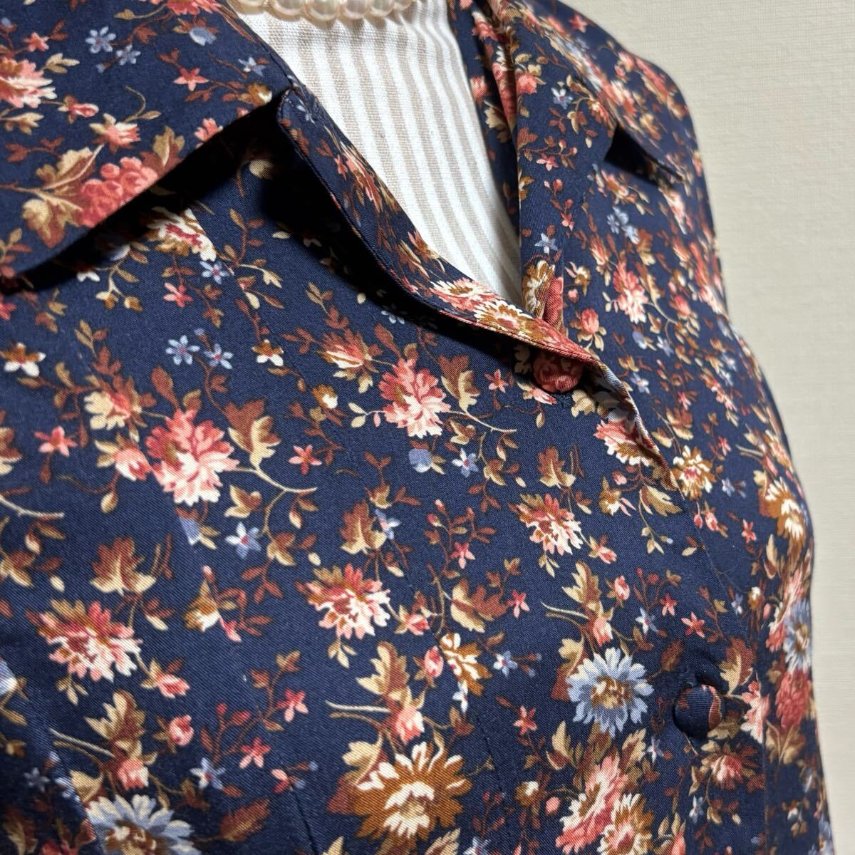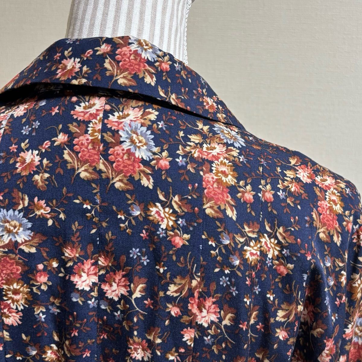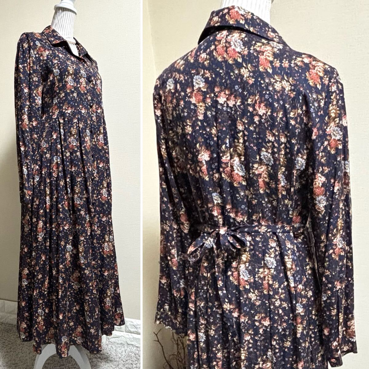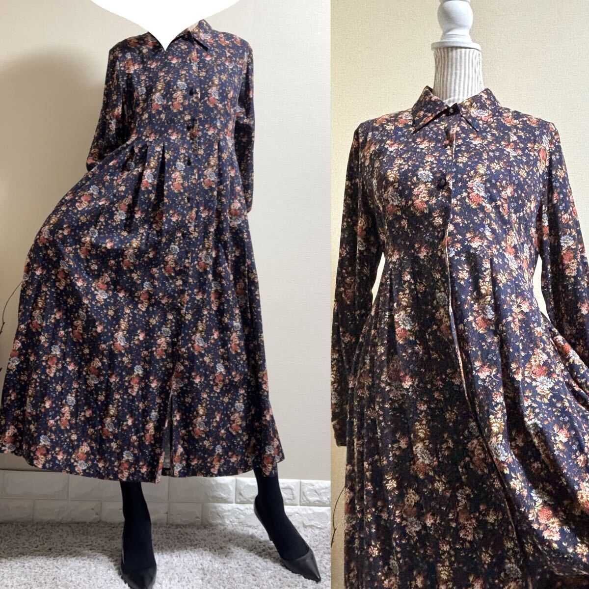 開襟デザインにもステンカラーにも出来るフローラル 花柄 アンティークフラワープリント 長袖ロングフレアワンピースです。