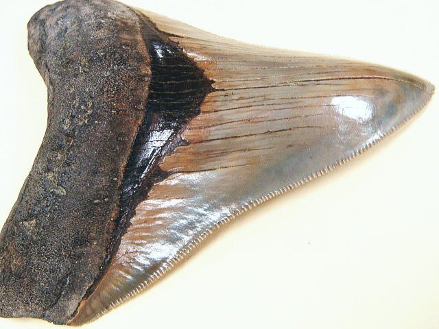 艶、光沢は金属的とも言える見事な照りのエナメロイドを否が応でも見せつけてくれる最高峰のメガロドンの歯と言えます!!!!