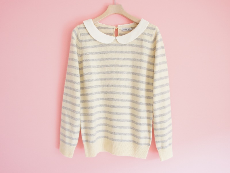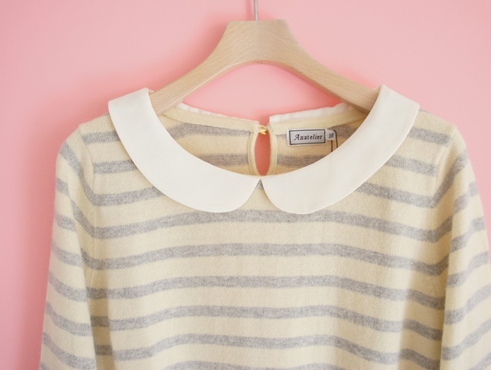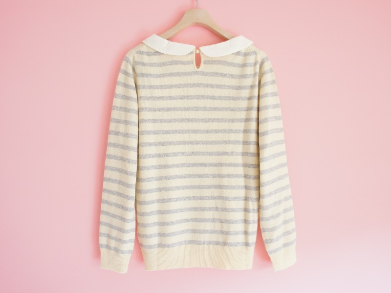 清楚な印象のラウンドカラーを別生地でアレンジしたニットプルオーバーです。暖かみのあるカラーボーダー柄が◎ ネック後ろにはドロップ形のホールにパールビジューのアクセントでフェミニン度もアップ。カジュアルからキレイめスタイルまで幅広くマッチします。